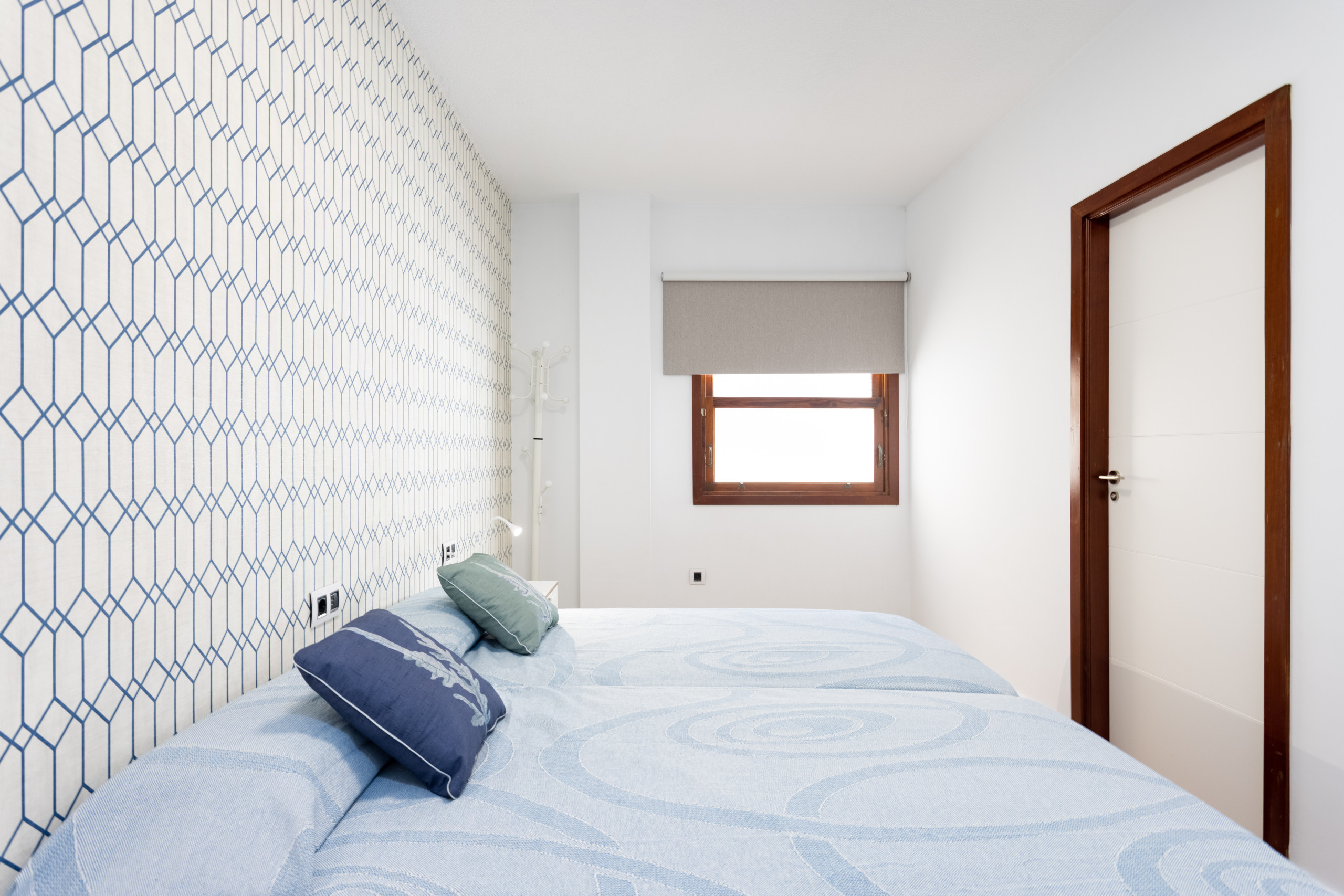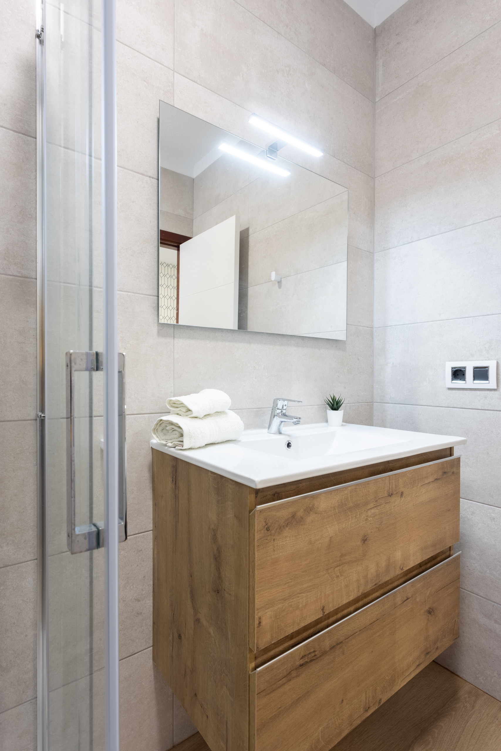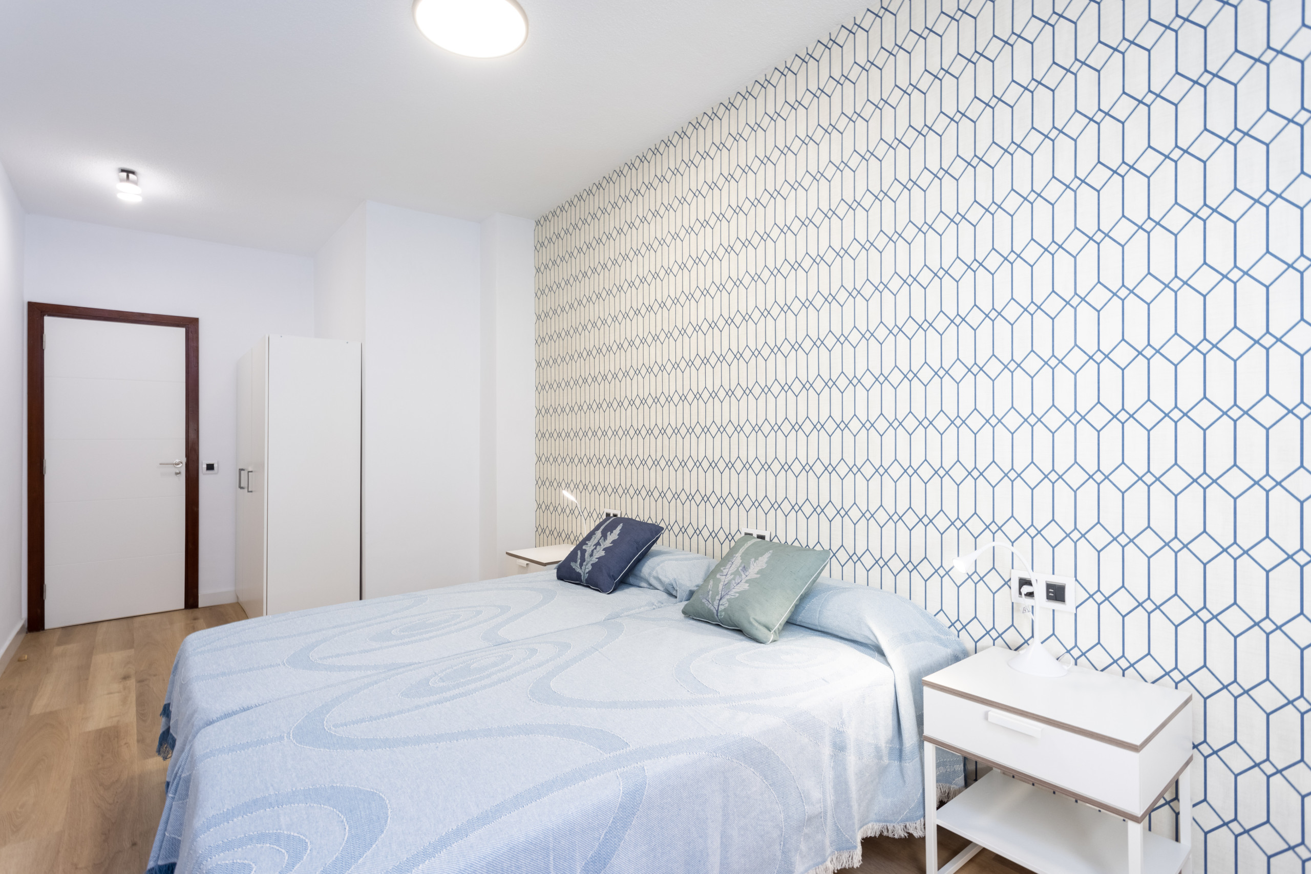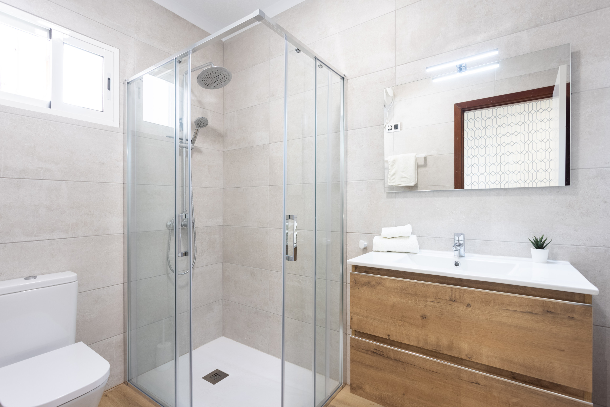 The apartment has three bedrooms. The first has two single beds and an en-suite bathroom with a shower. The second has a double bed and a full bathroom just opposite. The third also has a double bed and a private en-suite bathroom. All spaces have been designed to offer comfort, functionality, and a cosy experience.