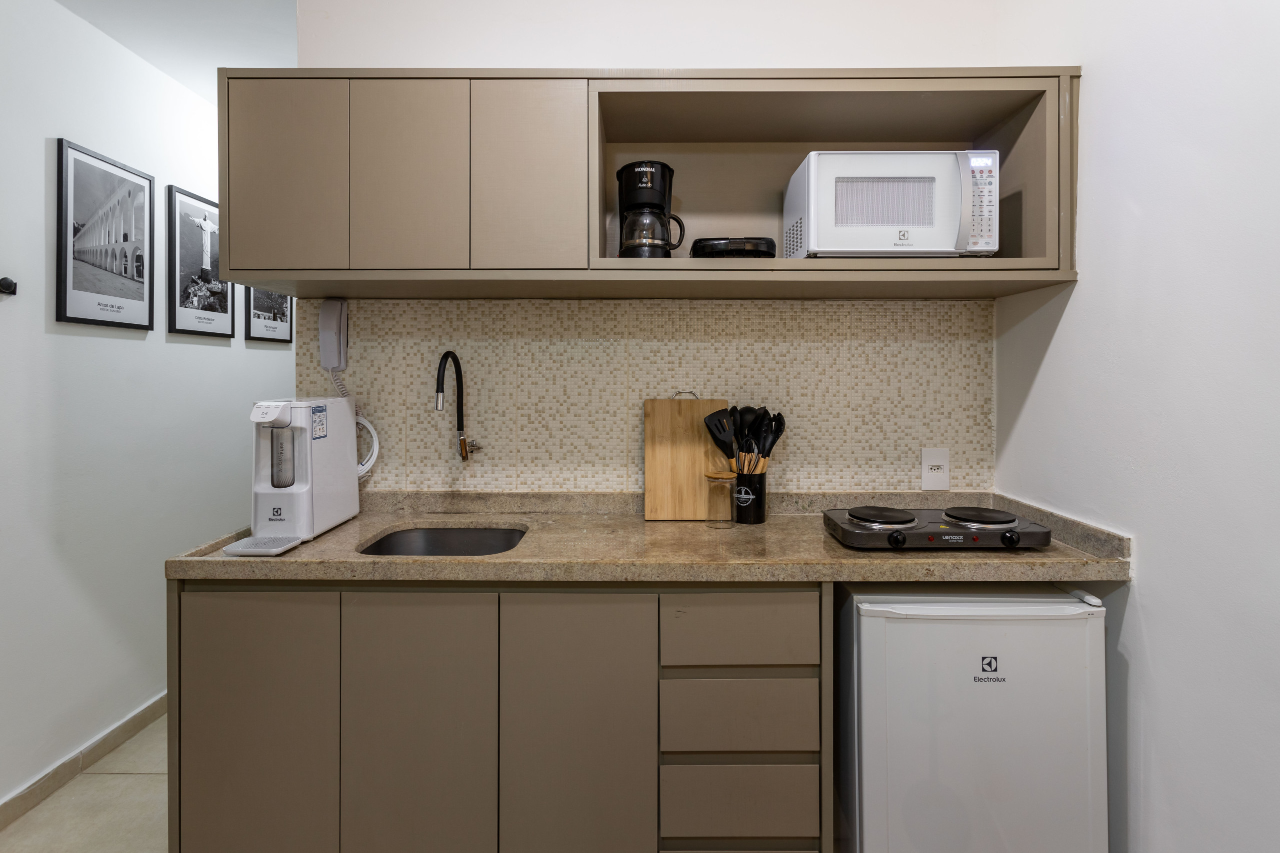 🍽️ Kitchen with mini-fridge, cooktop and various utensils;