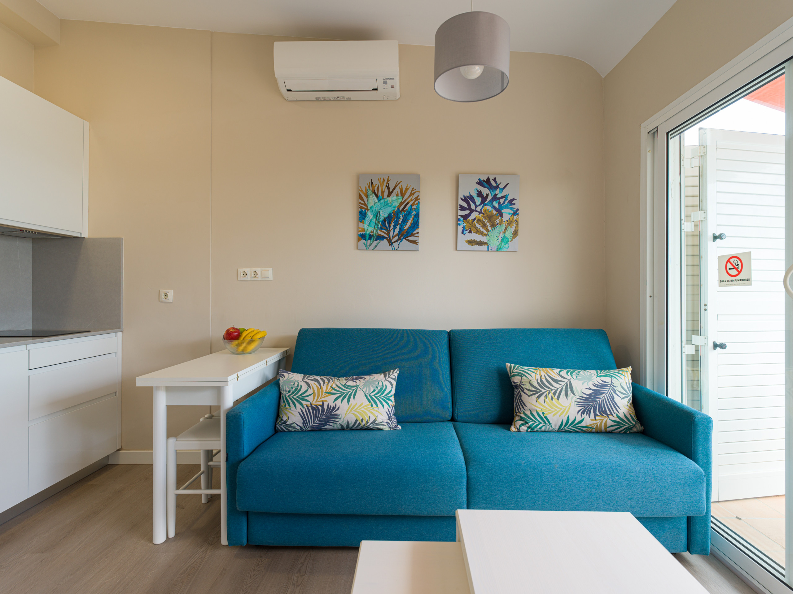 The accommodation has a bedroom with two single beds and views of the back patio with the swimming pool and a double sofa bed in the living room.