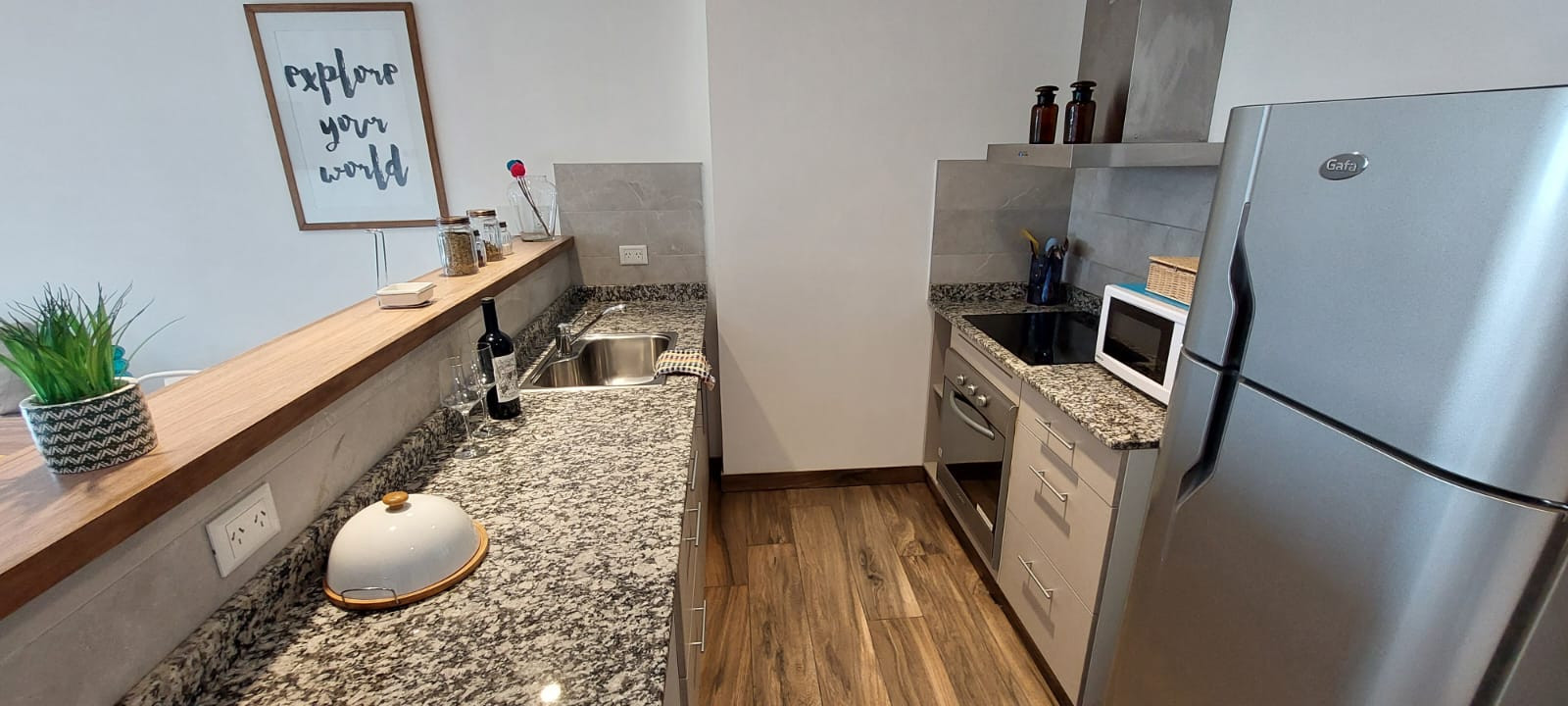 The main living area houses a fully equipped kitchen, a dining area, and a comfortable living room. A small balcony with two chairs gives you the opportunity to enjoy the views. With its own parking space strategically located near the main entrance and an elevator for easy access to the building, experience the luxury of a hotel with the flexibility of a fully equipped apartment. Make this space your home while exploring the wonders of Bariloche!