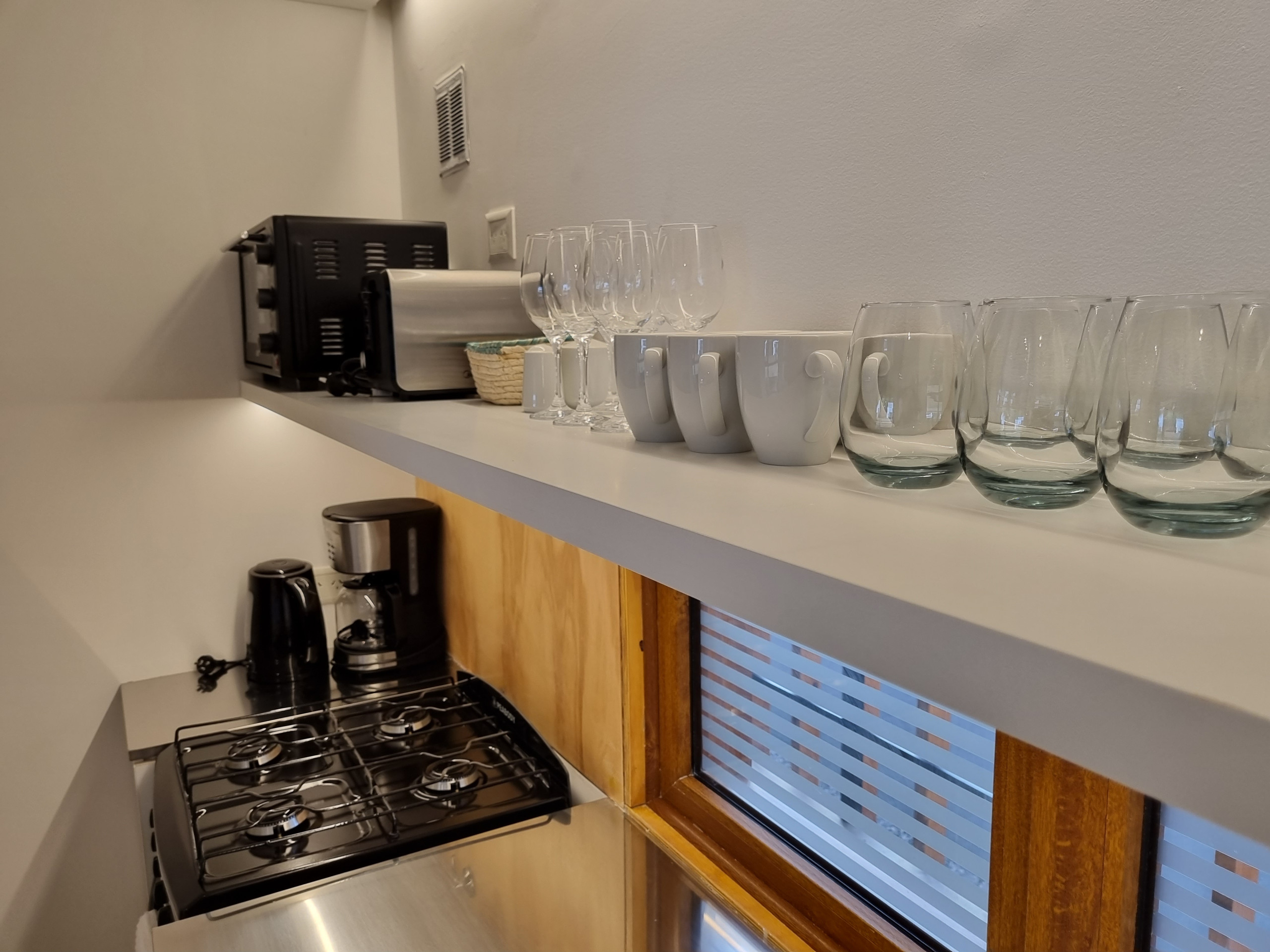 In the gas open plan kitchen, refrigerator, microwave, dishes/cutlery, kitchen utensils, coffee machine, toaster and kettle are provided.