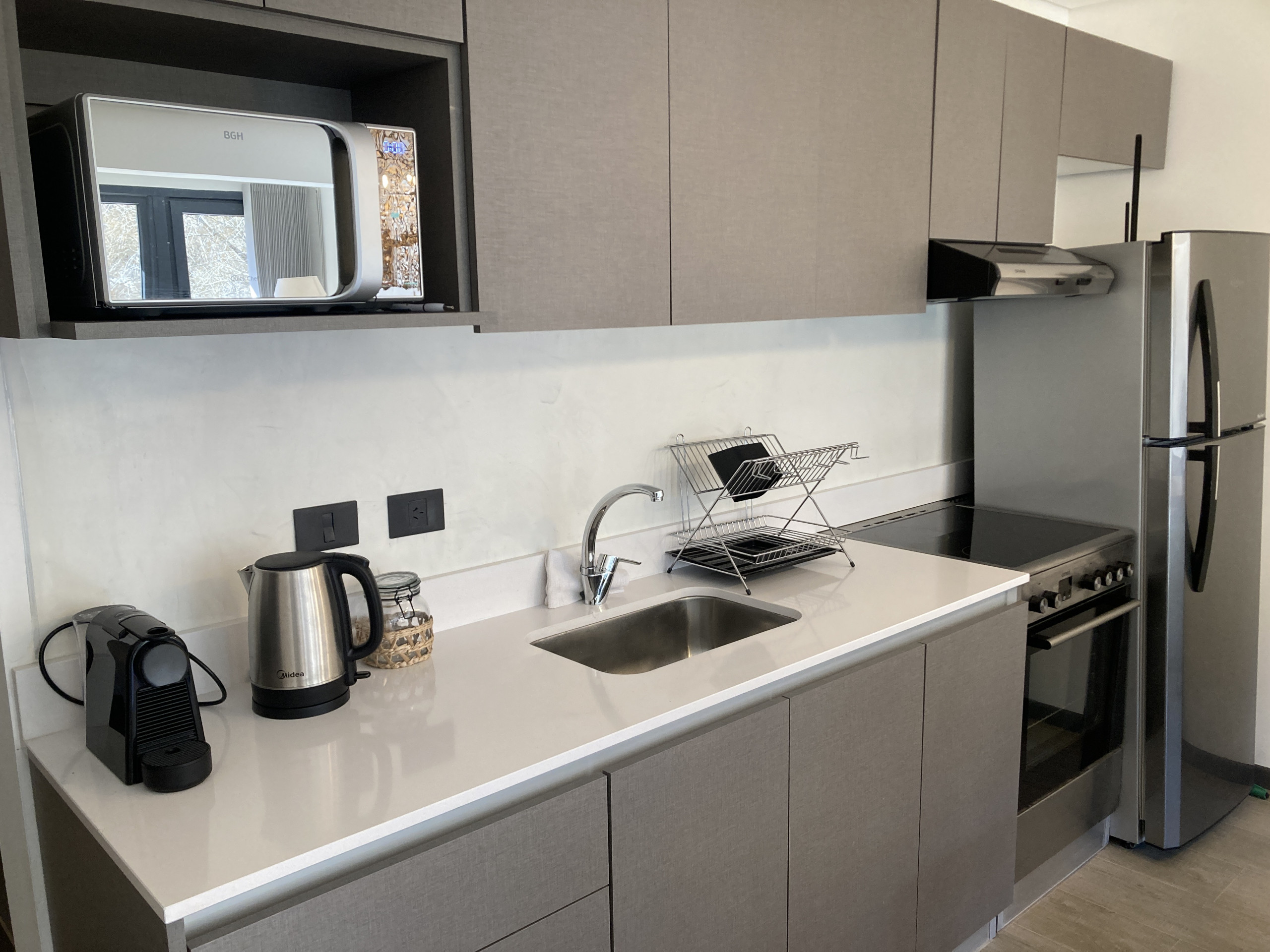 In the electric open plan kitchen, refrigerator, microwave, oven, dishes/cutlery, kitchen utensils, coffee machine, toaster and kettle are provided.