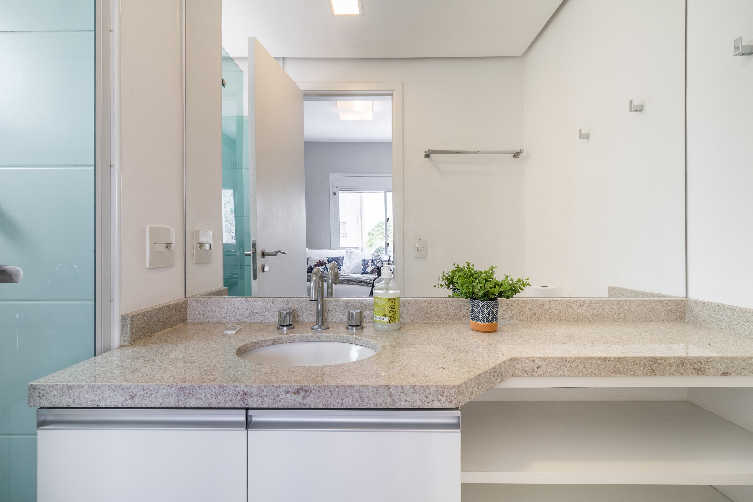 In the living room, you will find a dining table with seating for 4, a sofa bed that provides flexibility to accommodate guests, as well as a balcony that brings natural light and a space to relax.