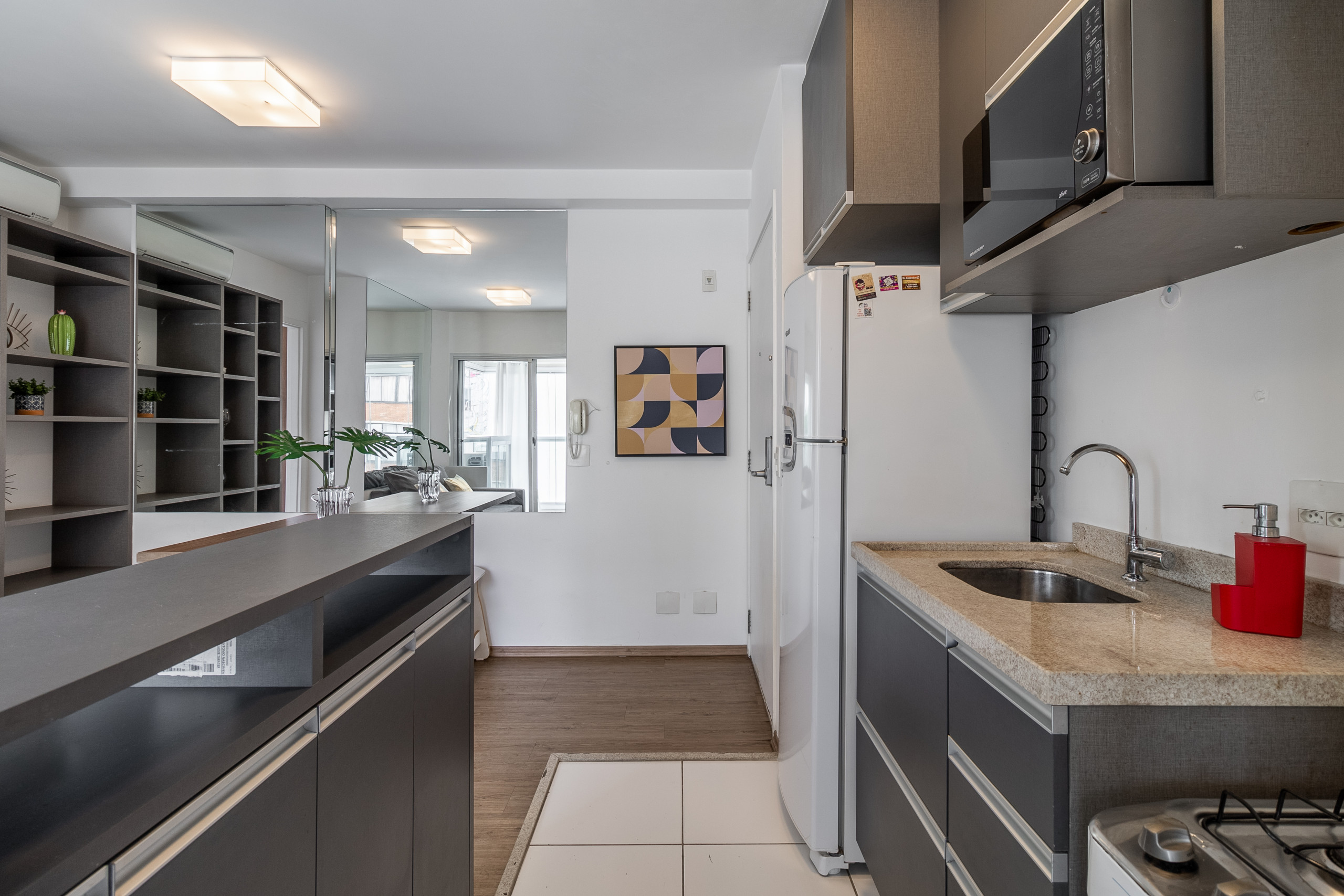 The kitchen is fully equipped and perfect for those who enjoy cooking, with a 4-burner stove, refrigerator, microwave, coffee maker, sandwich maker, and various utensils to make your daily life easier.