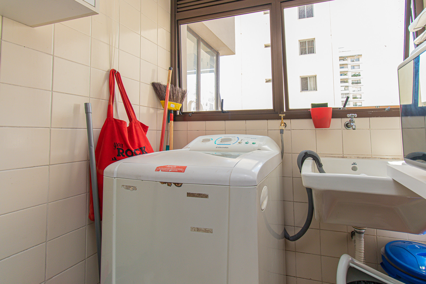 Na área de serviço, você encontrará uma máquina de lavar e um ferro de passar roupas