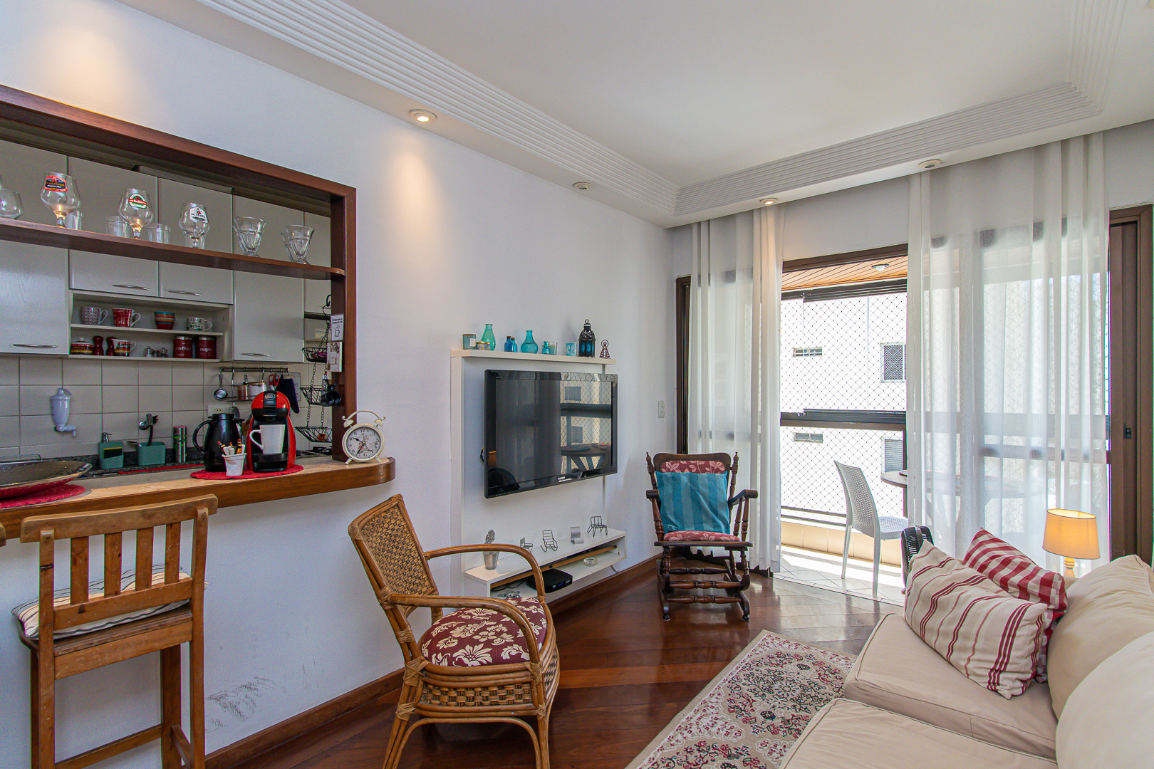 Na hora de descansar, relaxe em uma cadeira de balanço com uma vista para a cidade. Além disso, a sala de estar possui sofá, TV a cabo e uma mesa perfeita para você realizar suas refeições.
