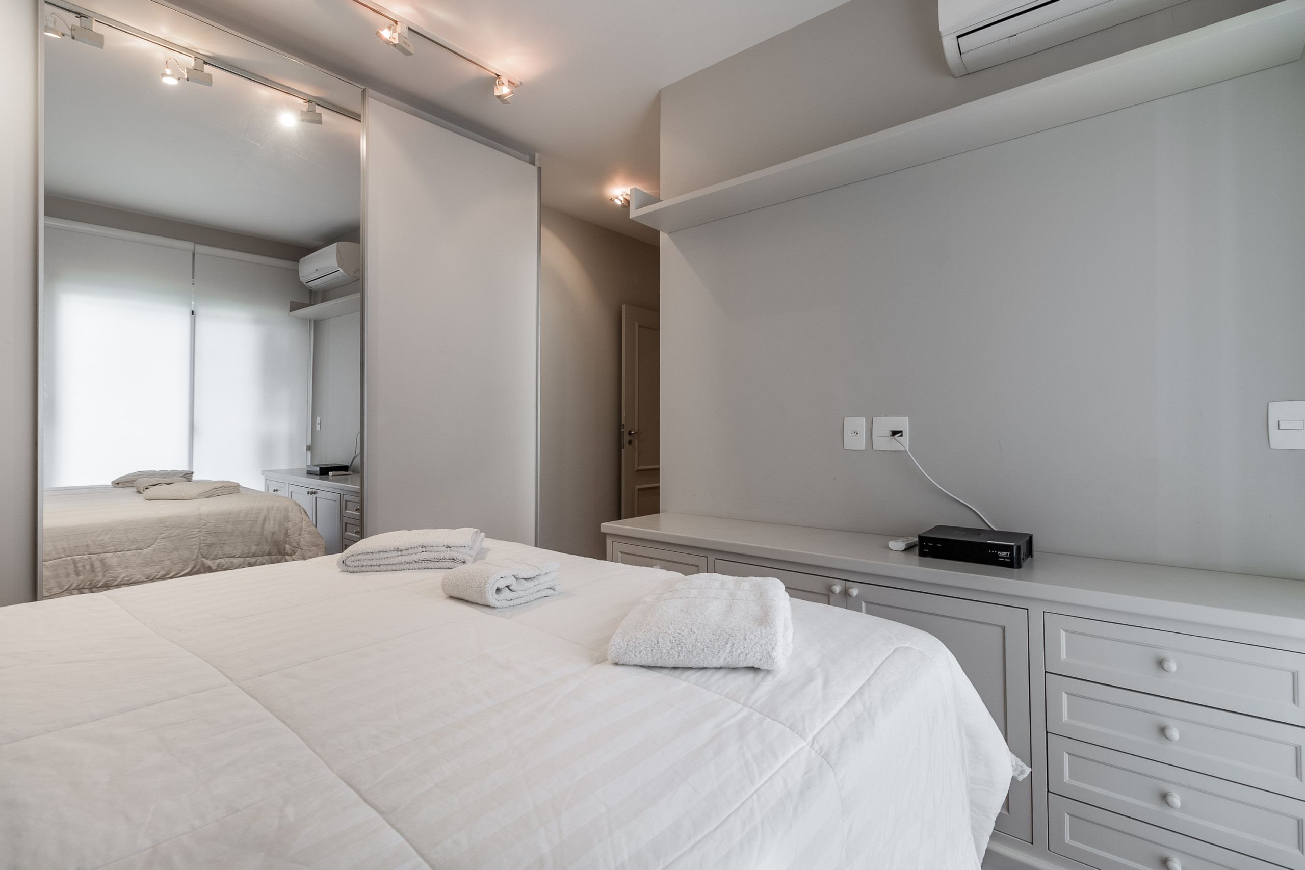 Suite with wardrobe with hangers, queen bed, air conditioning, lamps, trousseau, with 4 pillows on the beds, sheet, pillowcases and duvet line hotel, we use professional laundry. (extra trousseau requested during the stay is at an additional cost).