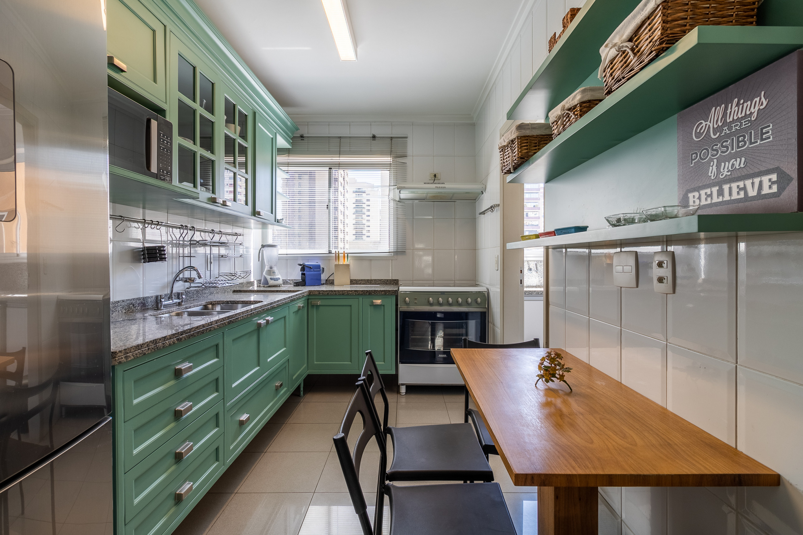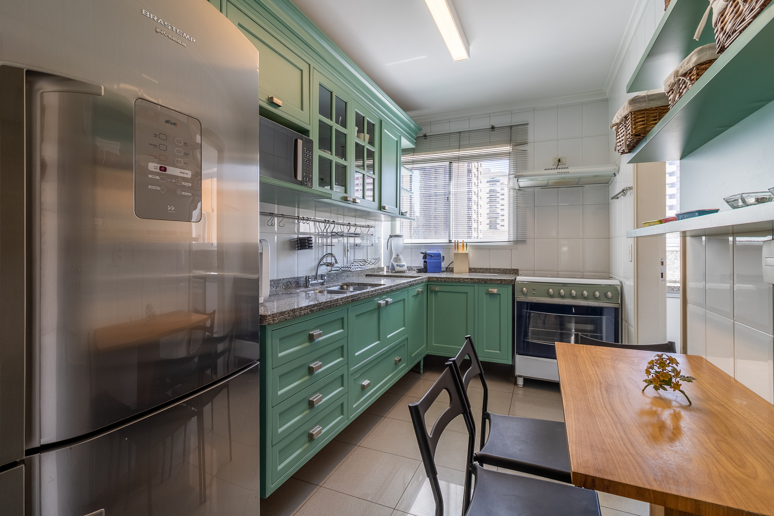- Kitchen equipped with oven and stove, refrigerator, dishwasher, Nespresso coffee maker, microwave, blender, sandwich maker and custom cabinetry