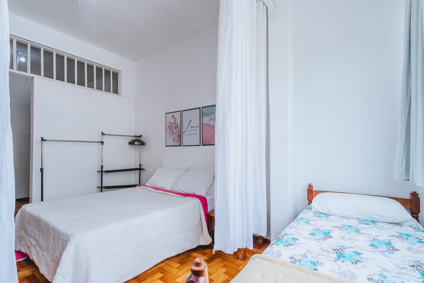 - In the bedroom there is 1 double bed, 1 single bed, coat rack with hangers and mattress protector