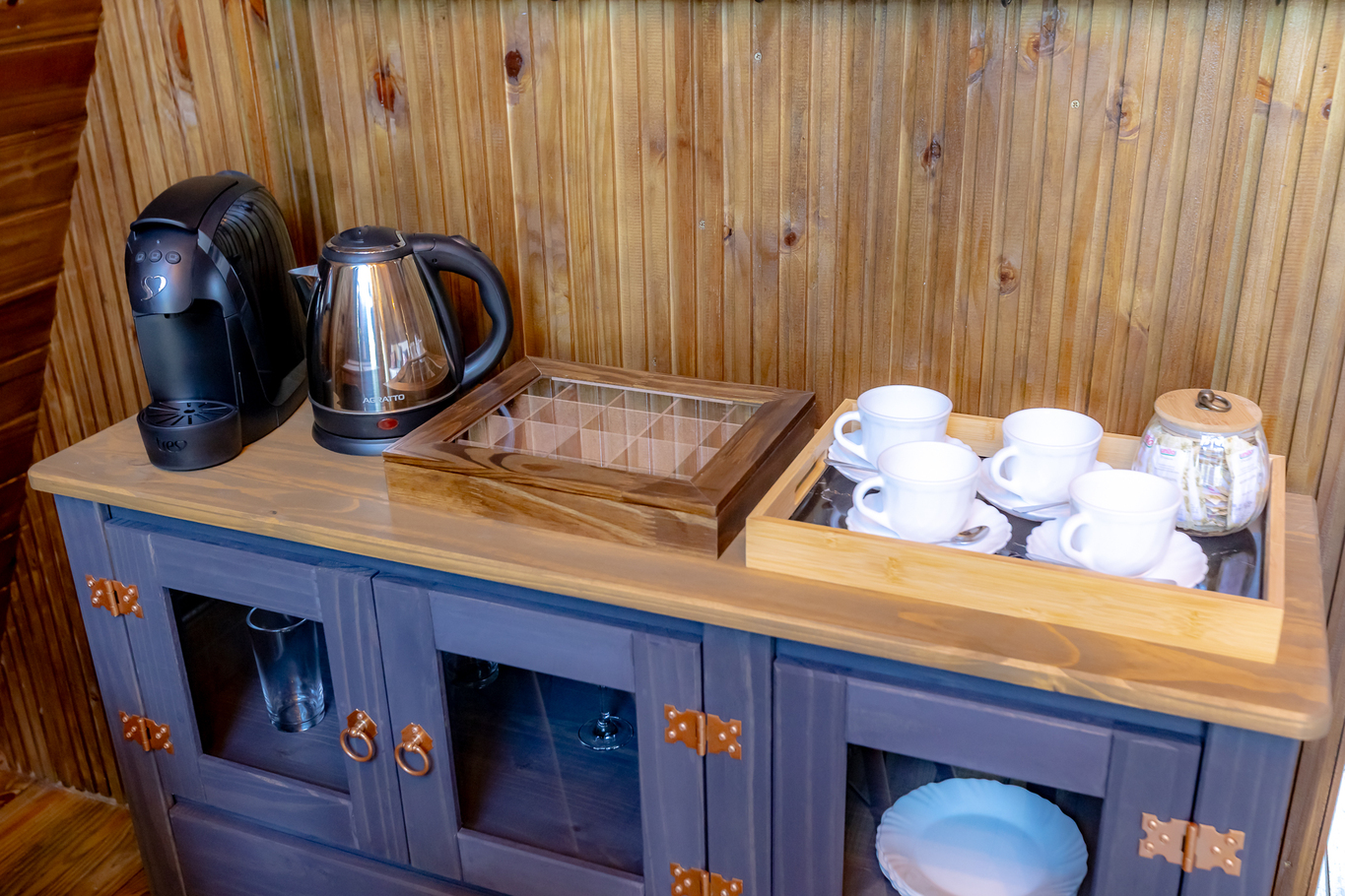 - The kitchen is separate from the property, located in the event space. It is equipped with various utensils, including capsule coffee maker, electric kettle, stove, refrigerator and kettle (except salt, pepper and oil)