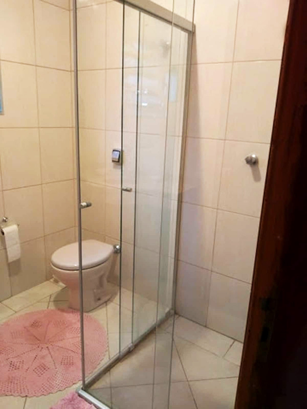 Os banheiros da chácara estão equipados com chuveiro elétrico, box de vidro e espelho.