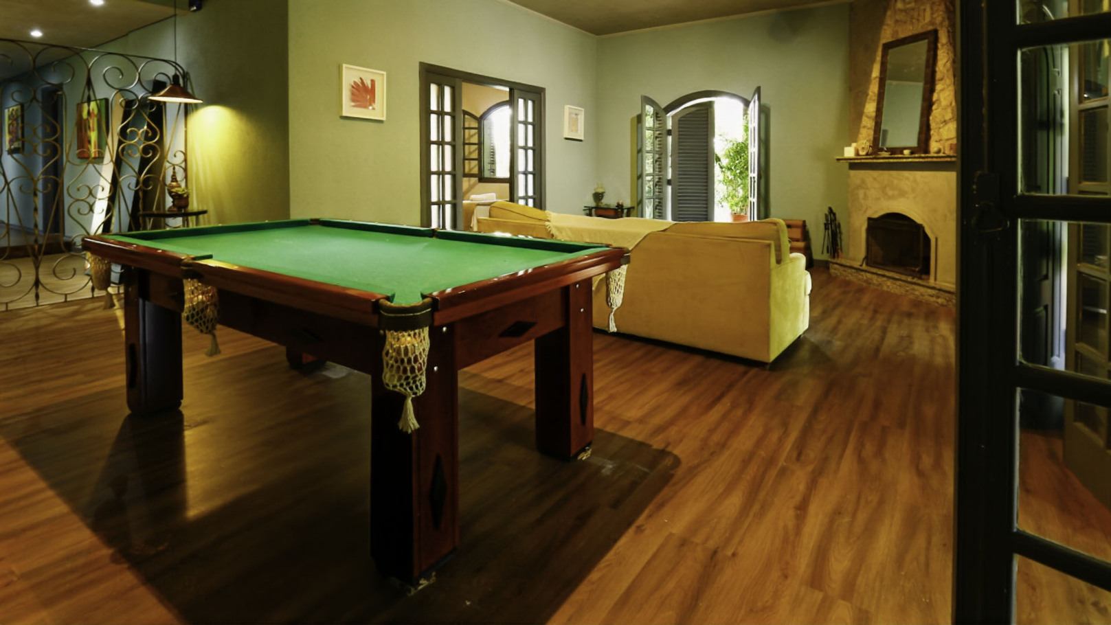 - The property has a fireplace room adjacent to the pool table and a TV room adjacent to the living, dining, and card rooms