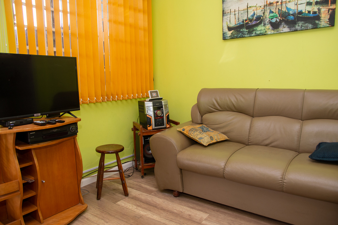 - Sala de estar equipada com poltrona, rádio, sistema de som, sofá e ventilador de teto