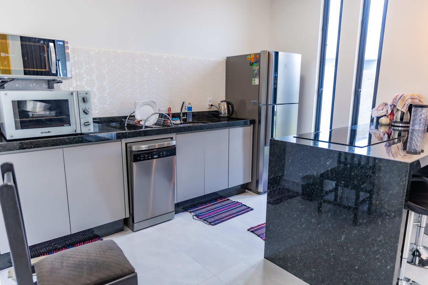 In the gas independent kitchen, refrigerator, microwave, oven, freezer, dishes/cutlery, kitchen utensils, coffee machine, juicer and hob are provided.