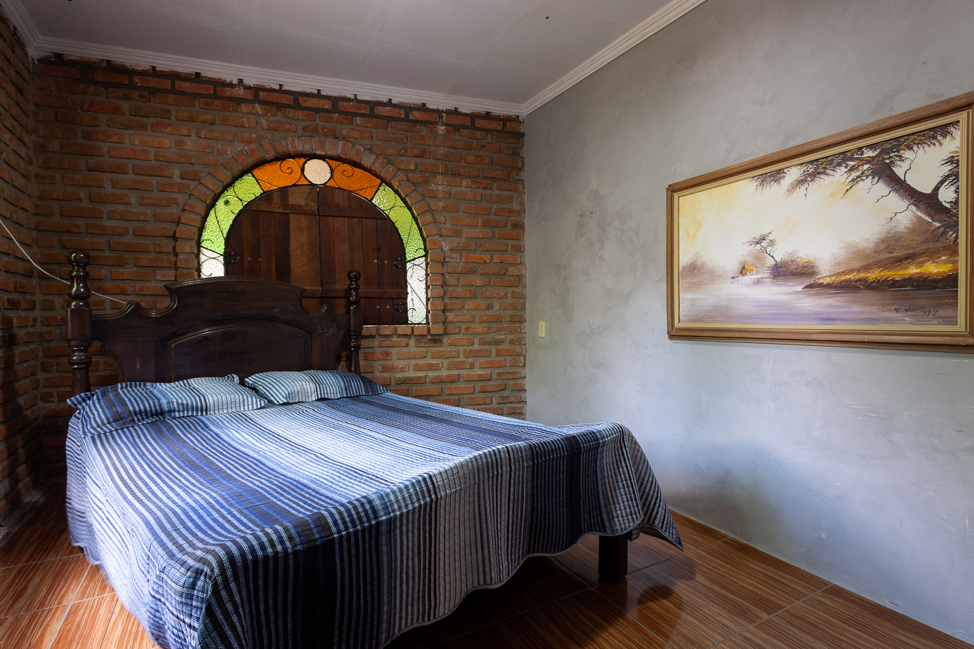 - Bedroom 1: double bed, bench wardrobe, and ceiling fan