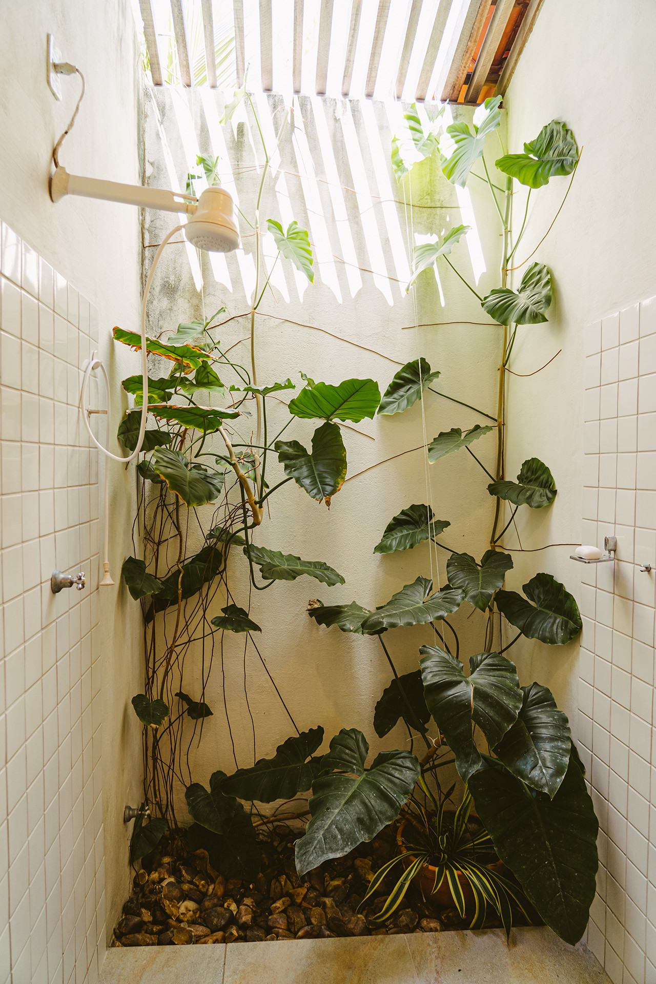 - Banheiro espaçoso com decoração rústica e jardim interno com pergolado de madeira (chuveiro sem aquecimento)