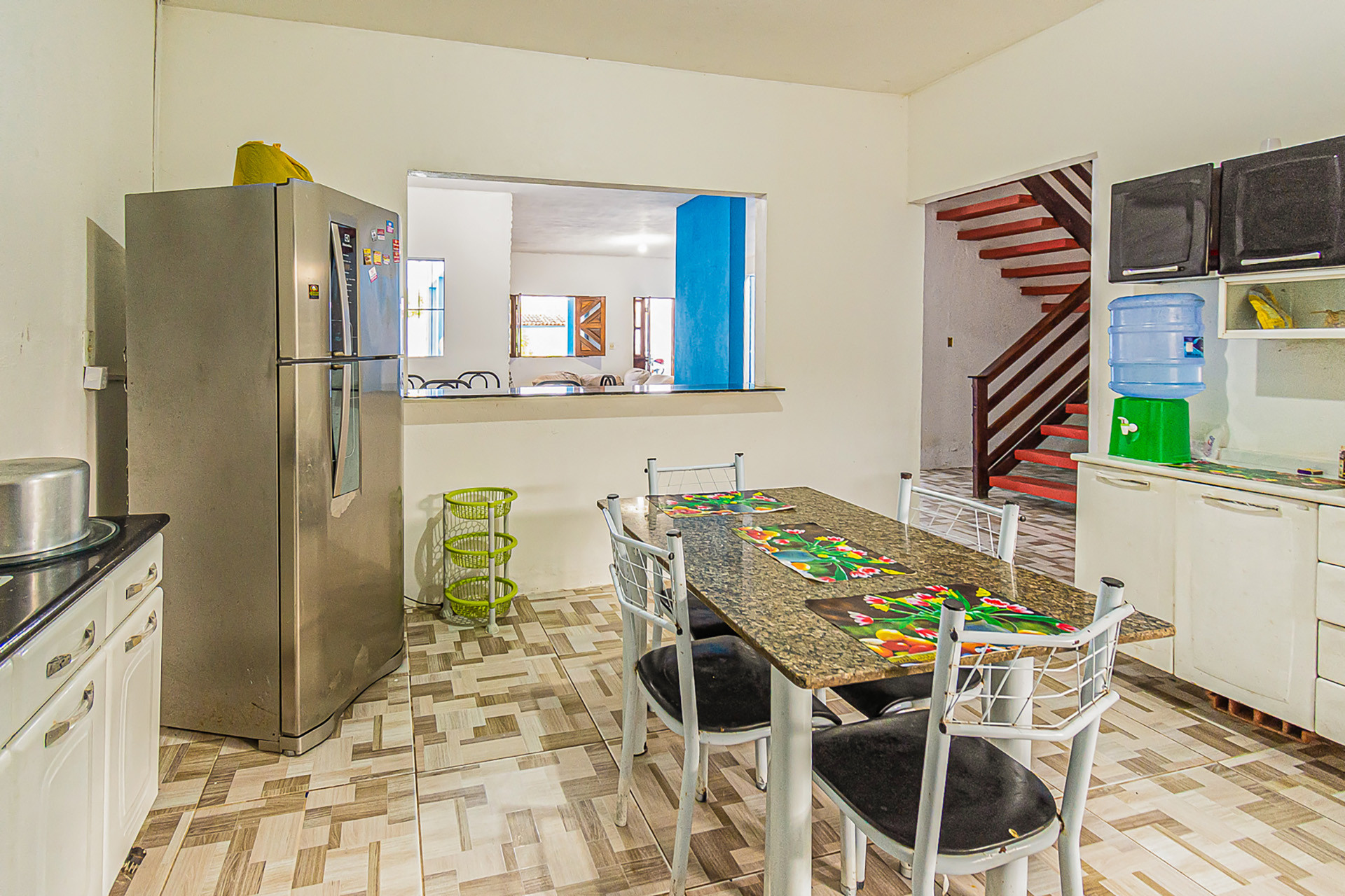 - A cozinha americana é espaçosa e possui diversos utensílios para preparar refeições, incluindo sanduicheira, fogão, geladeira, liquidificador, chaleira, balcão e mesa