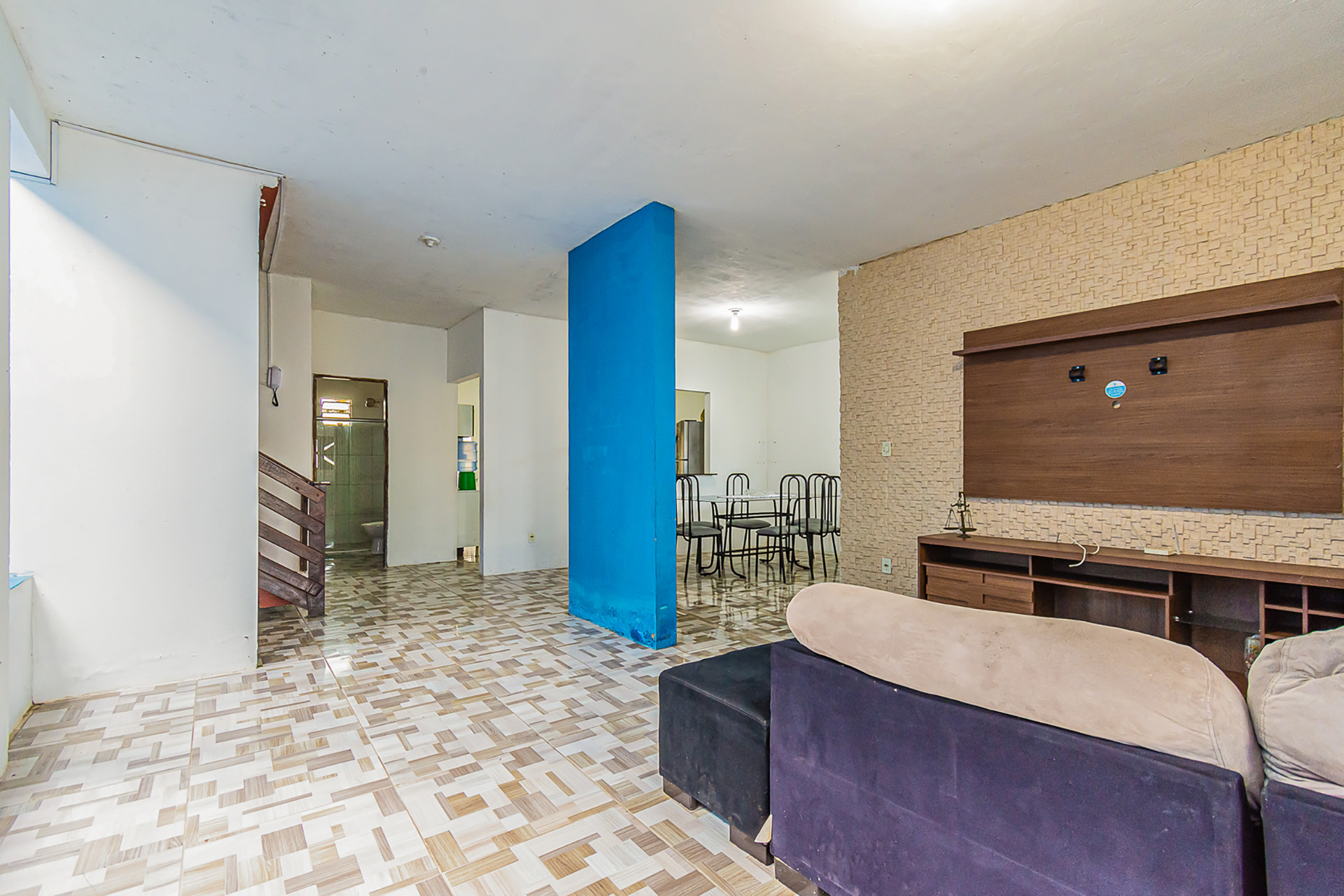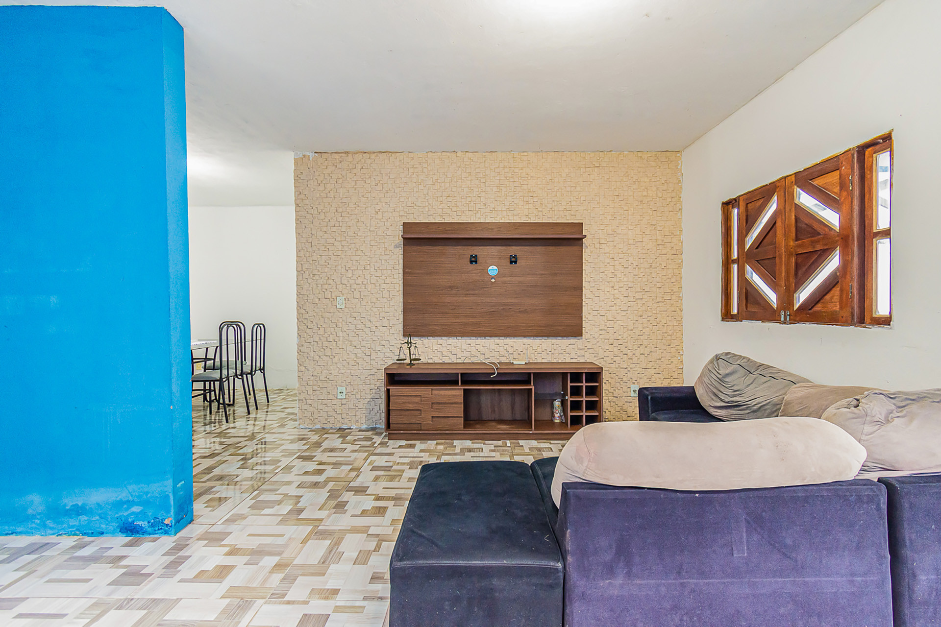 - A sala de estar é bem confortável e ampla, nela você encontra mesa de centro, grande sofá em L e TV