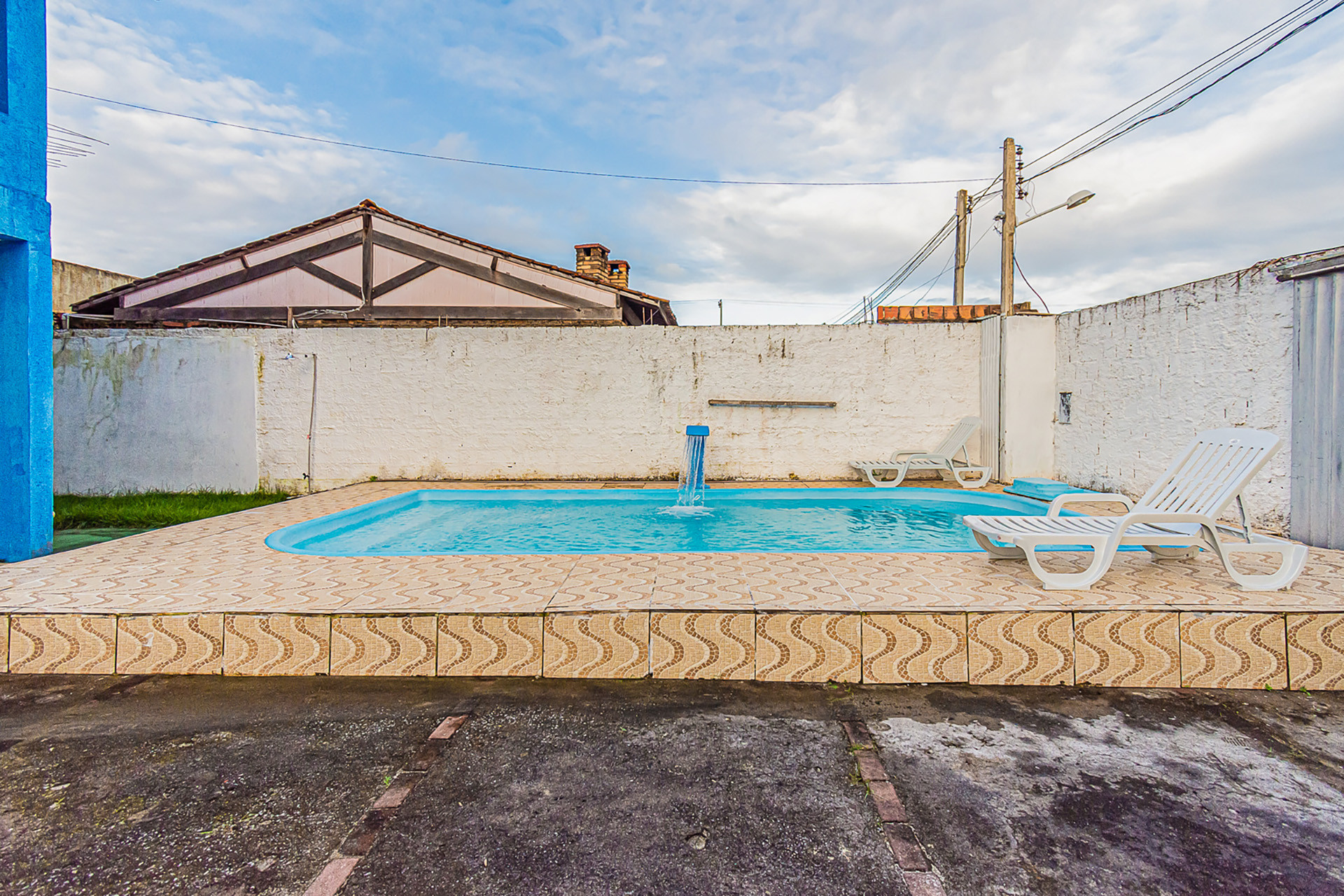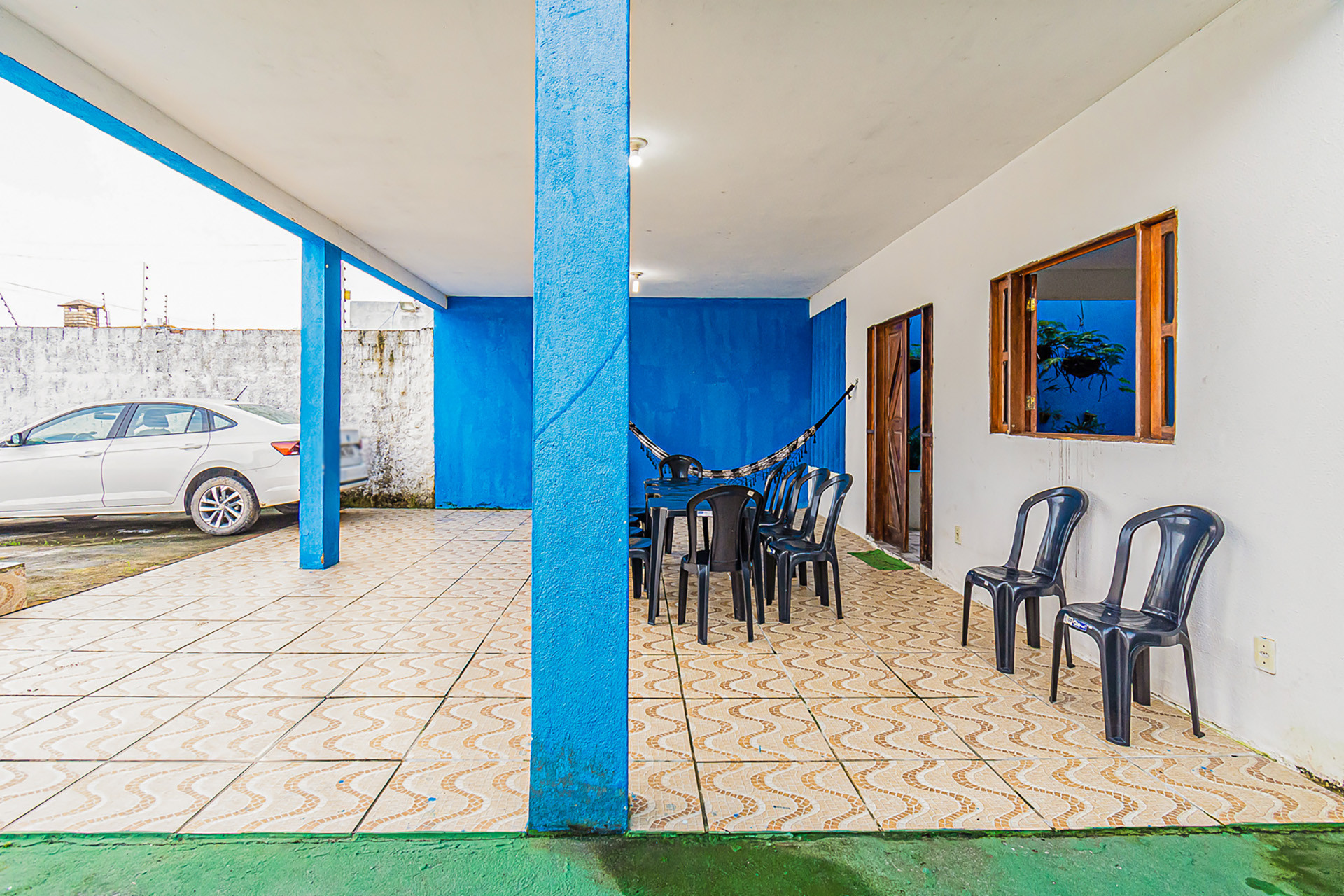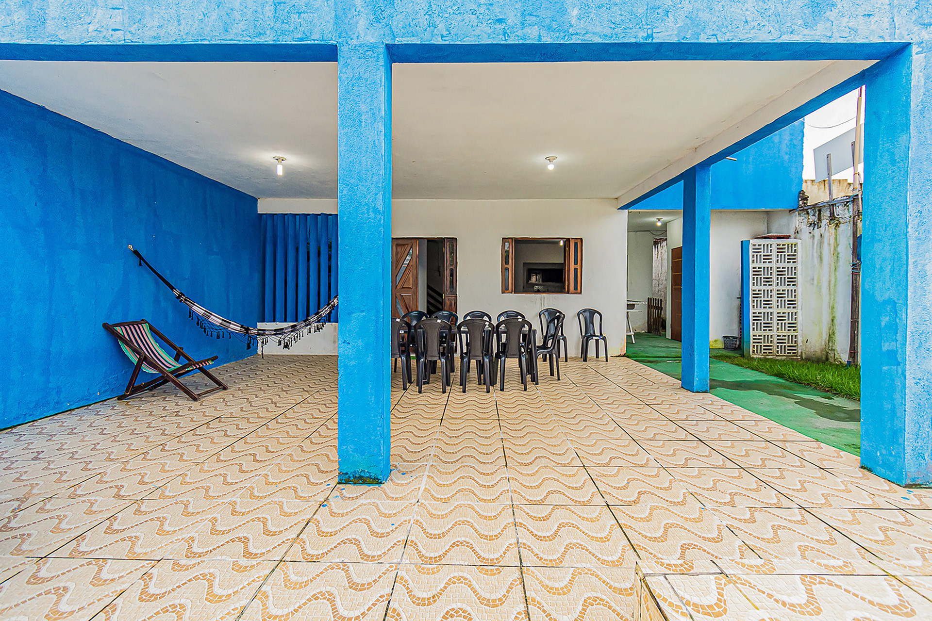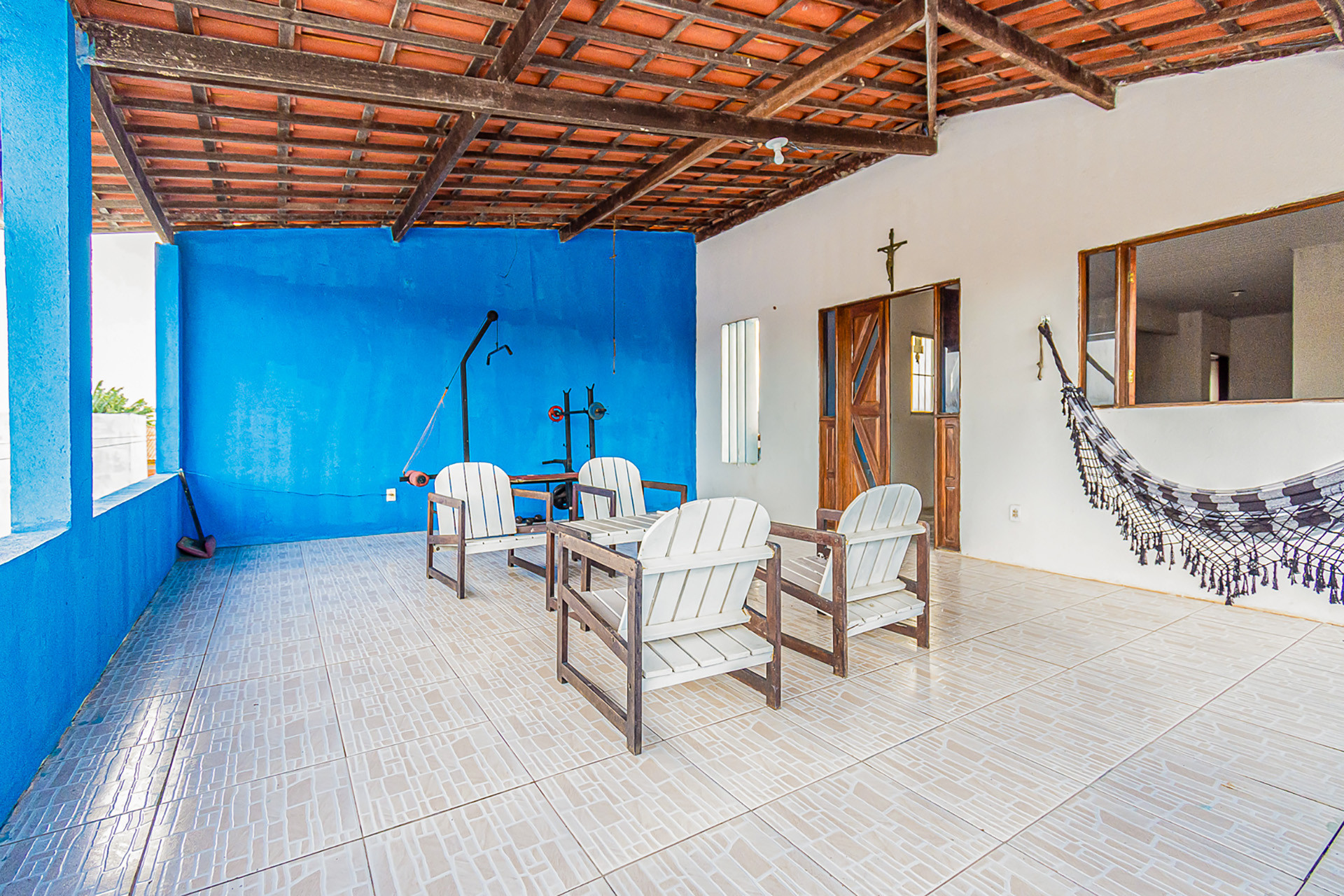 - Terraço coberto com freezer, balcão, mesa de apoio e 3 jogos de mesas de plástico com 12 cadeiras