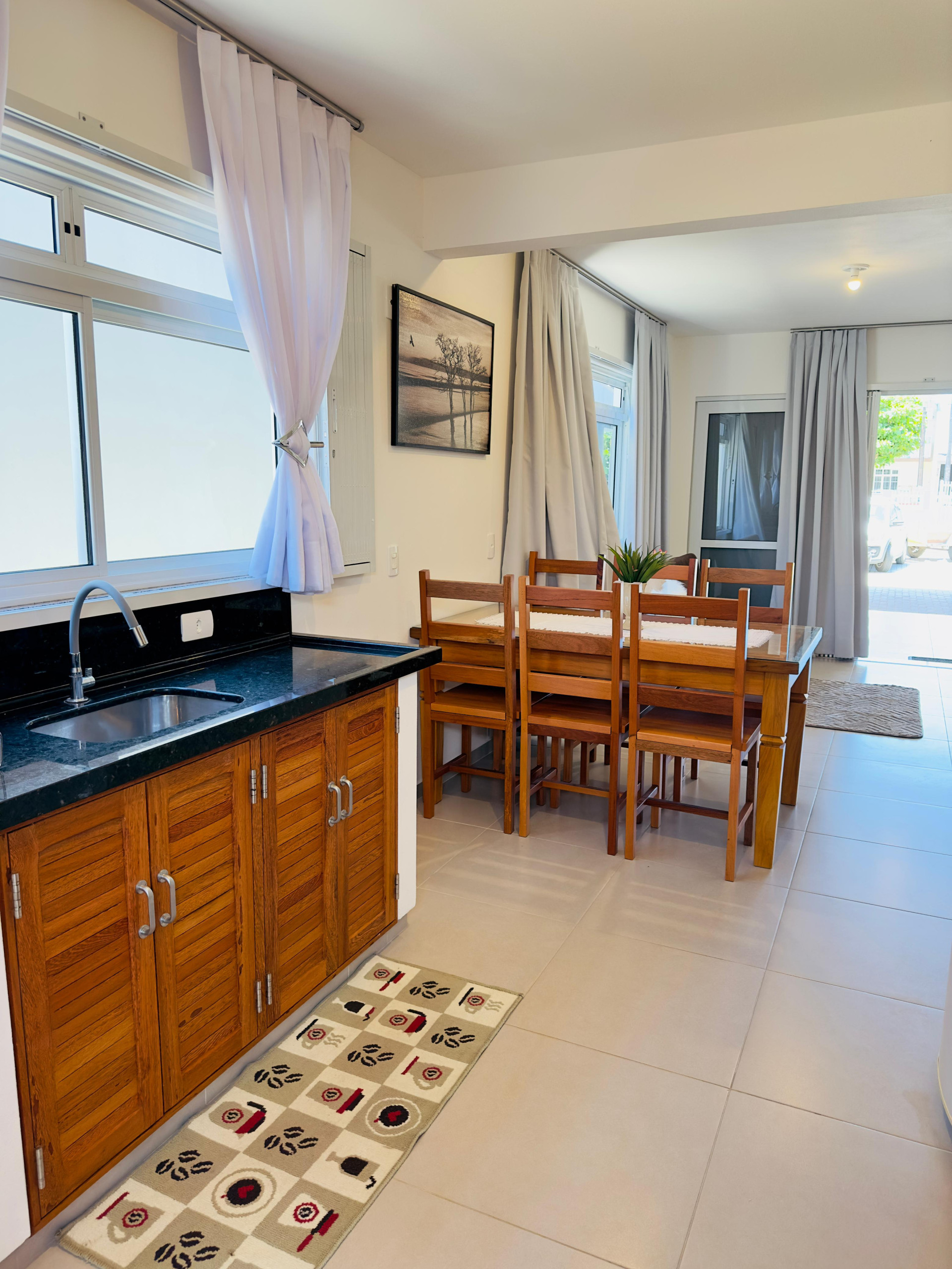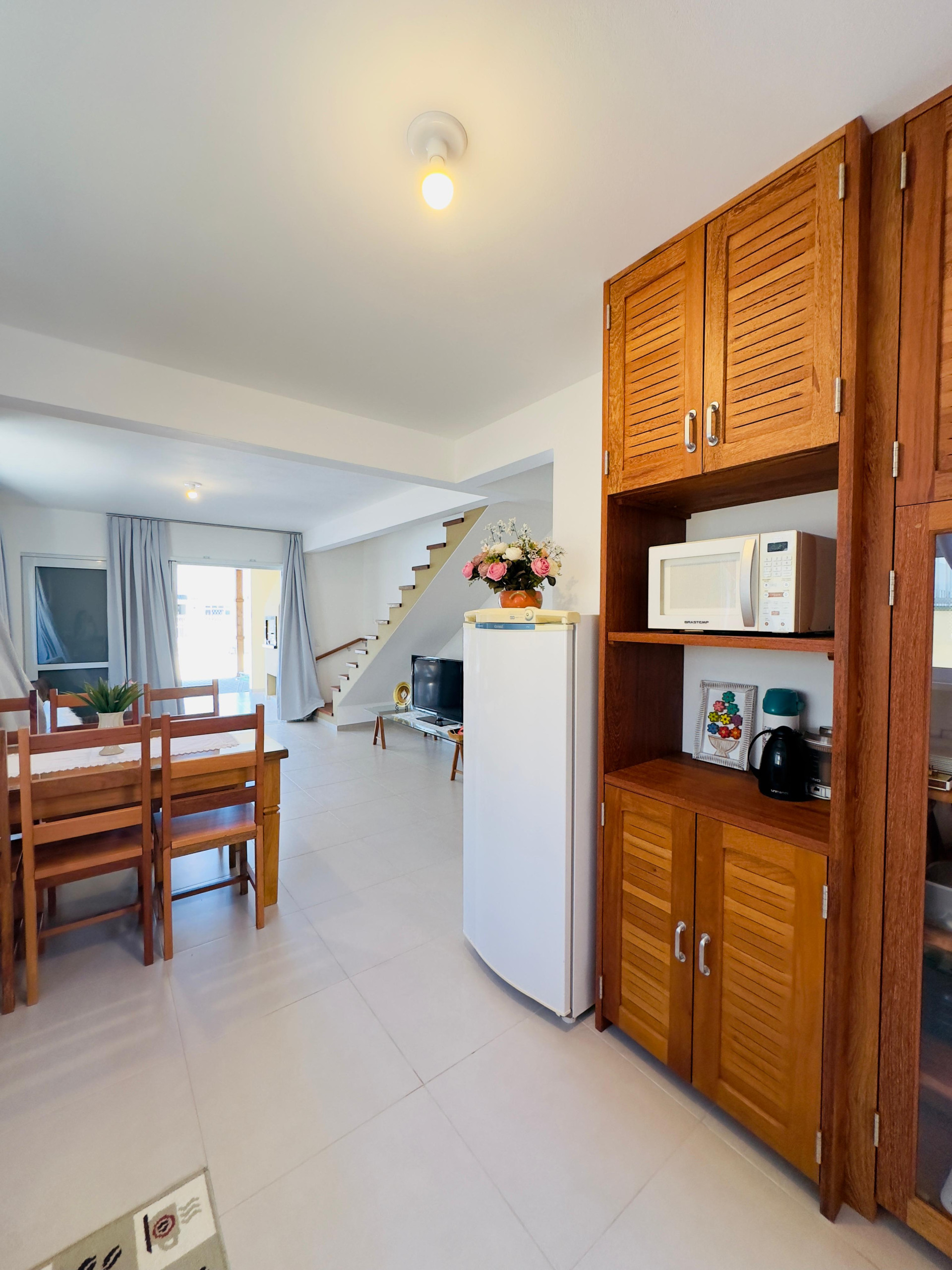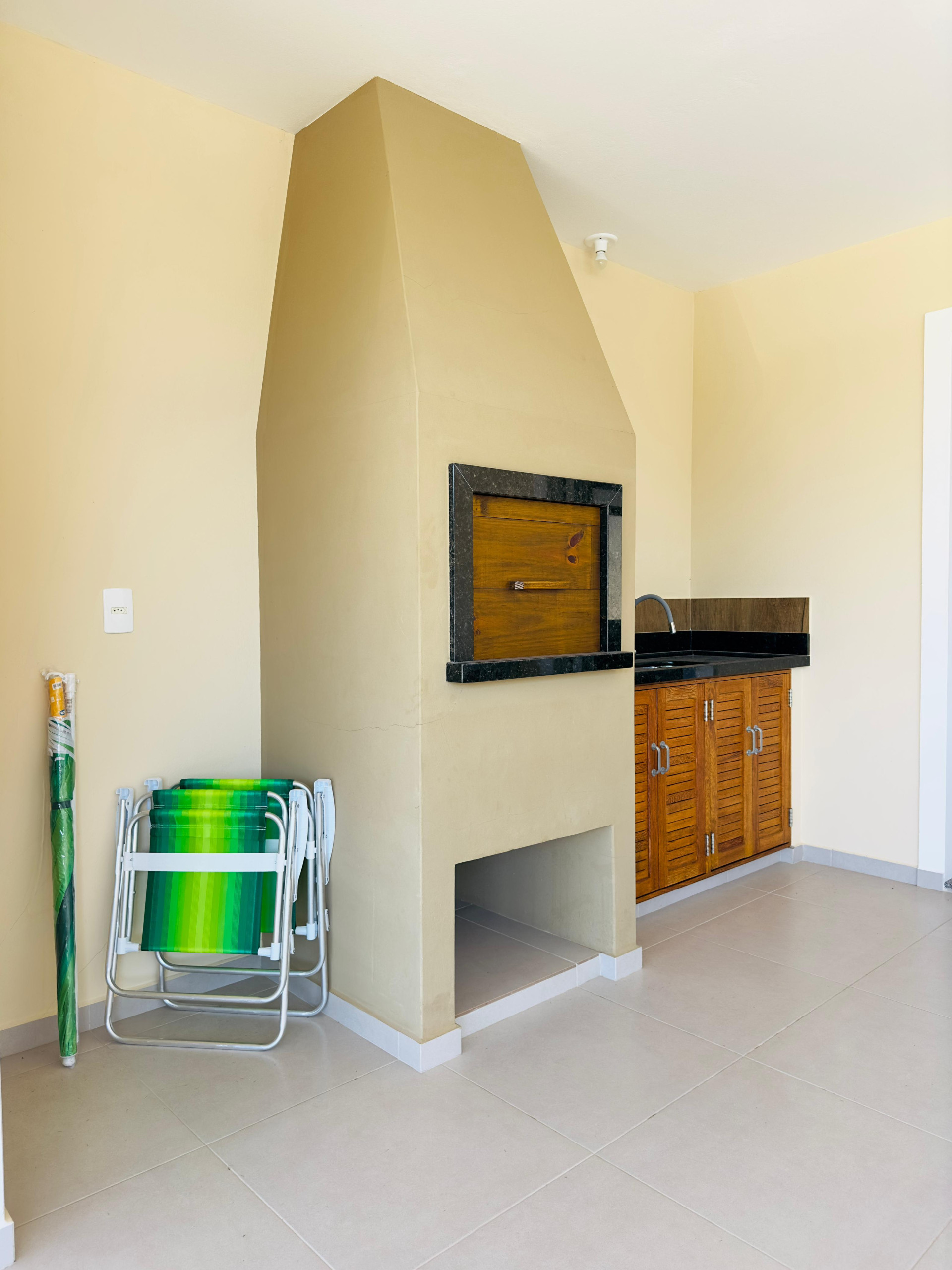 - A cozinha é compacta, mas tem os principais itens para que você possa preparar refeições, incluindo fogão com forno, geladeira, liquidificador e micro-ondas