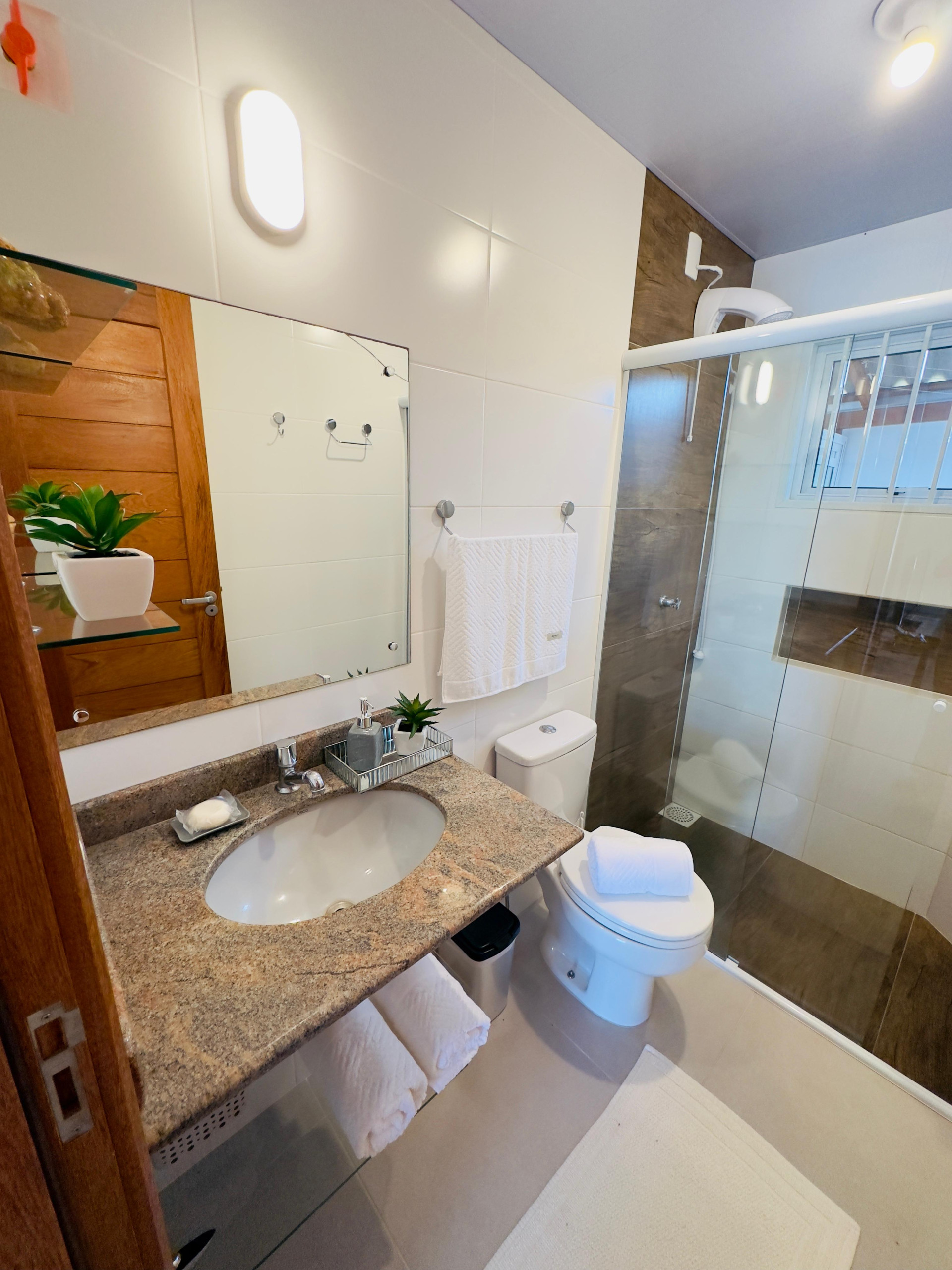 - Os banheiros têm chuveiro elétrico, box de vidro e espelho