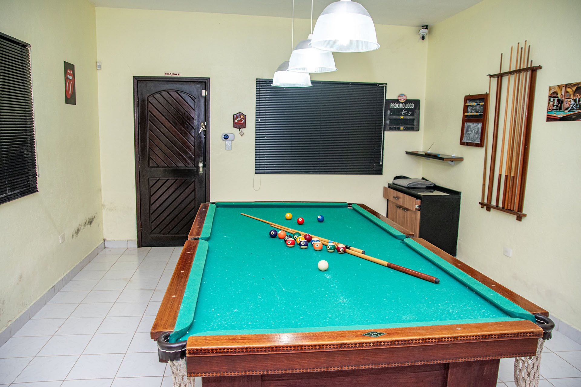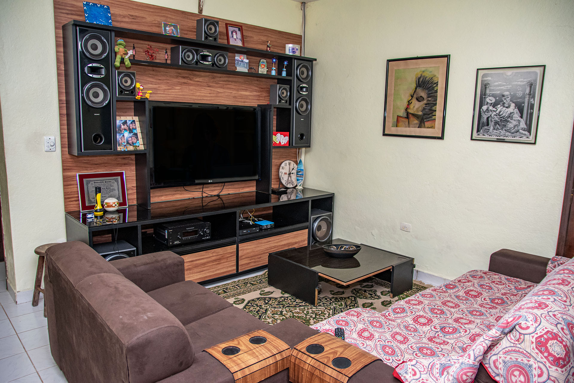 - A sala está equipada com rádio, sistema de som, sofá, e ventilador de teto