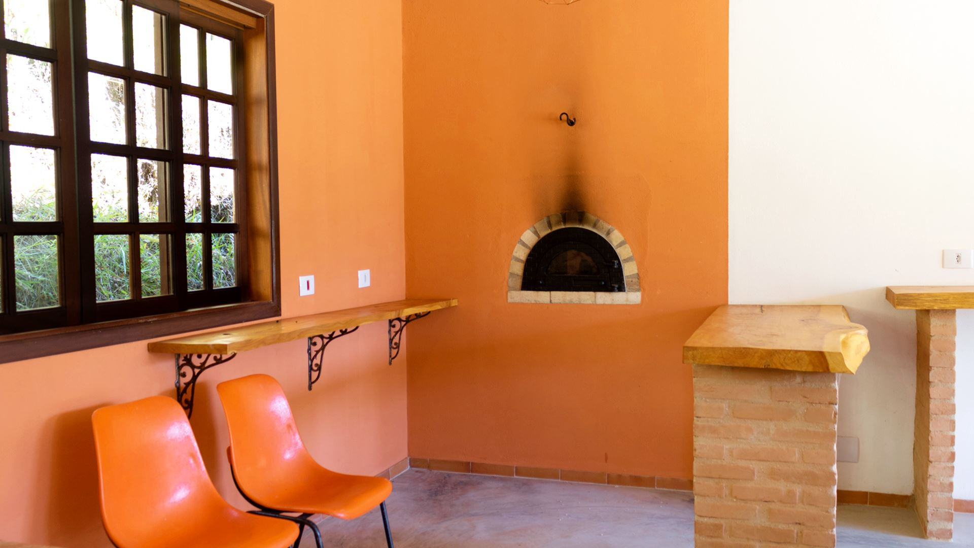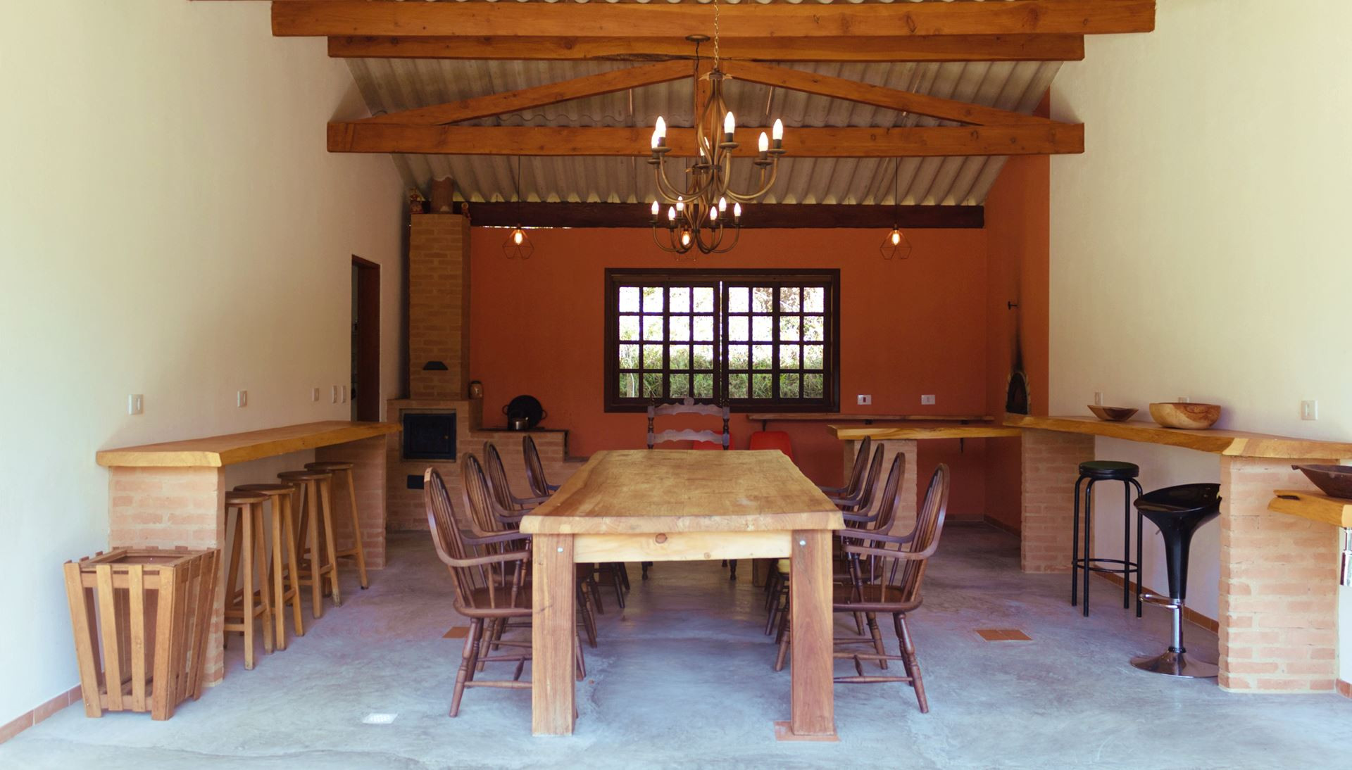- Área gourmet ampla com fogão e forno a lenha, grande mesa de jantar e balcão com banquetas