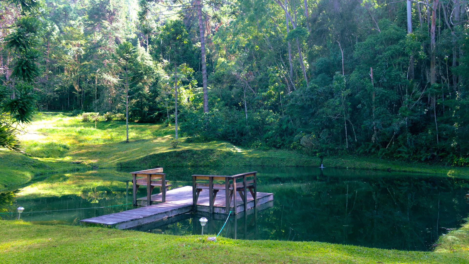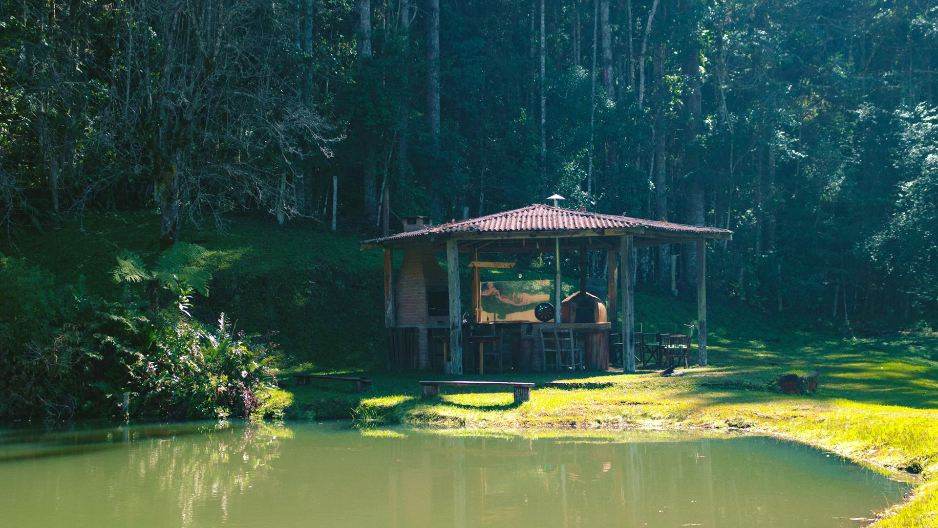 - Quiosque com churrasqueira e forno de pizza ao lado de um lindo lago