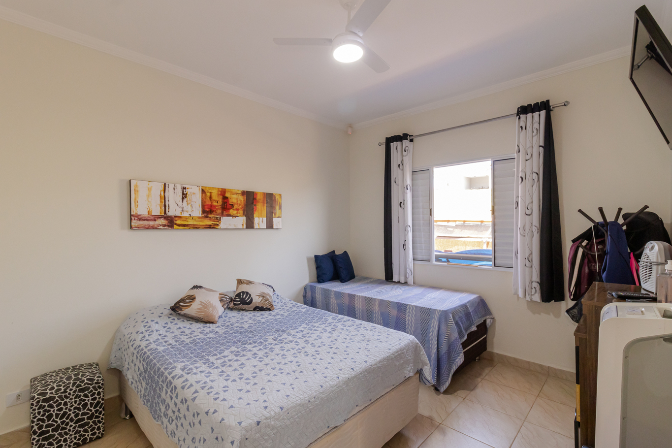 - Bedroom 3 (suite): double bed, bunk bed, wardrobe, Smart TV, fan and private bathroom with glass shower