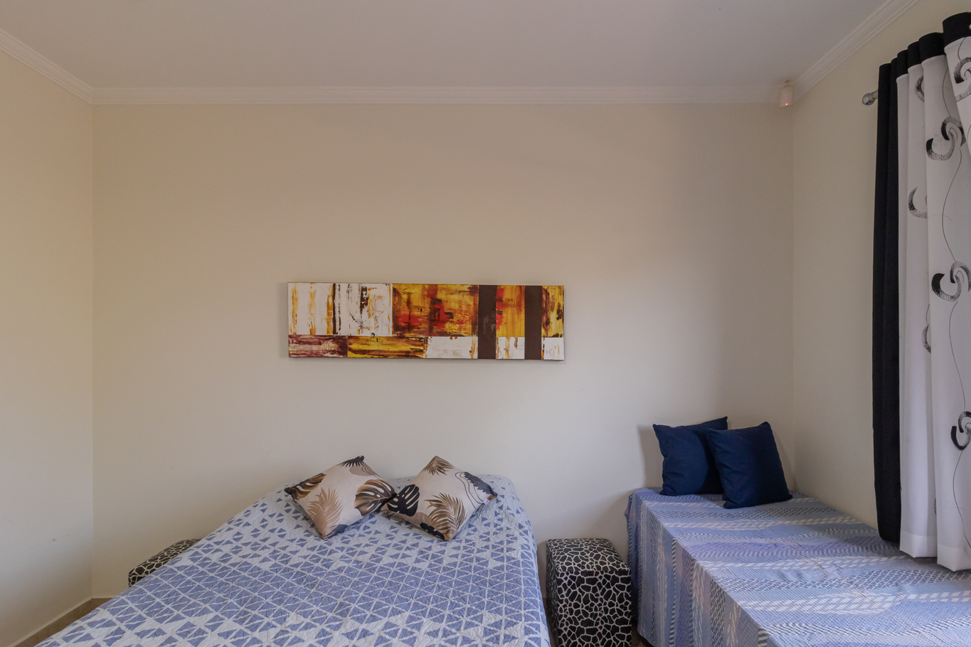 - Bedroom 2 (suite): double bed, single bed, wardrobe, Smart TV, fan and private bathroom with glass shower