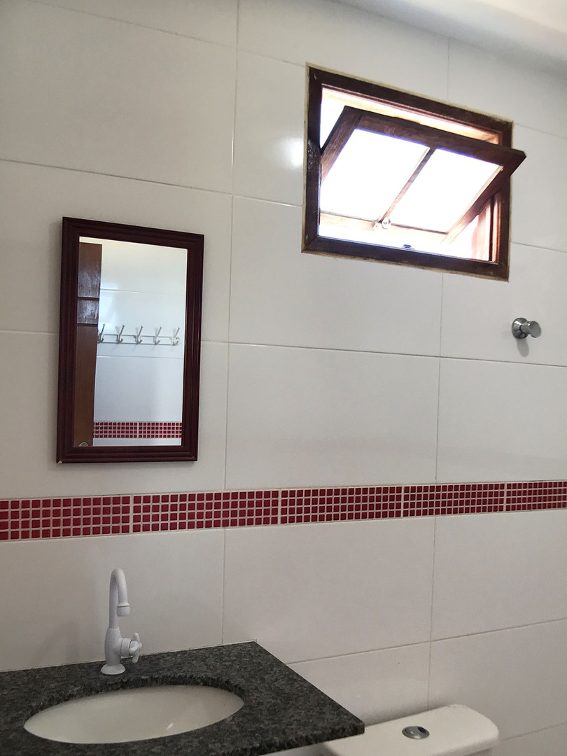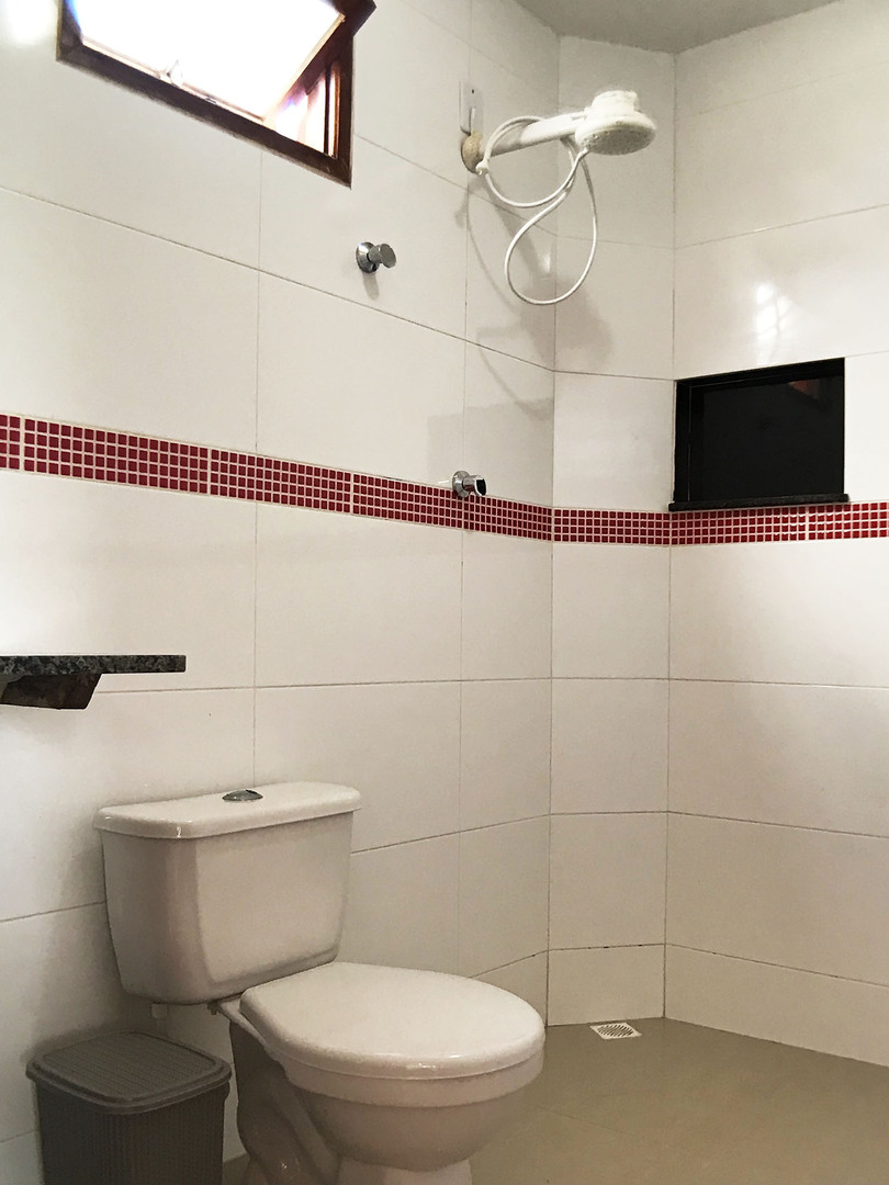 - Além do banheiro privativo da suíte, a casa conta com outros dois banheiros sociais com chuveiro elétrico