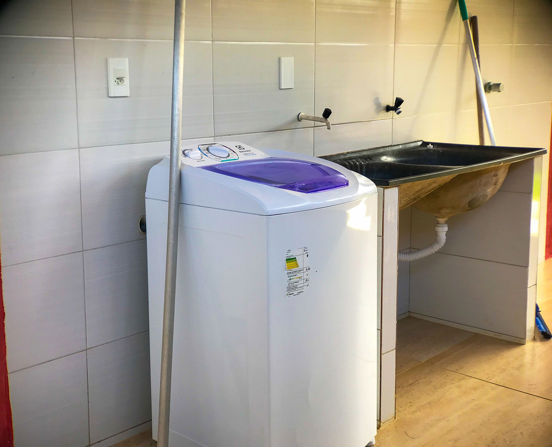 - A cozinha oferece fogão, geladeira, liquidificador, panelas, louças e utensílios variados