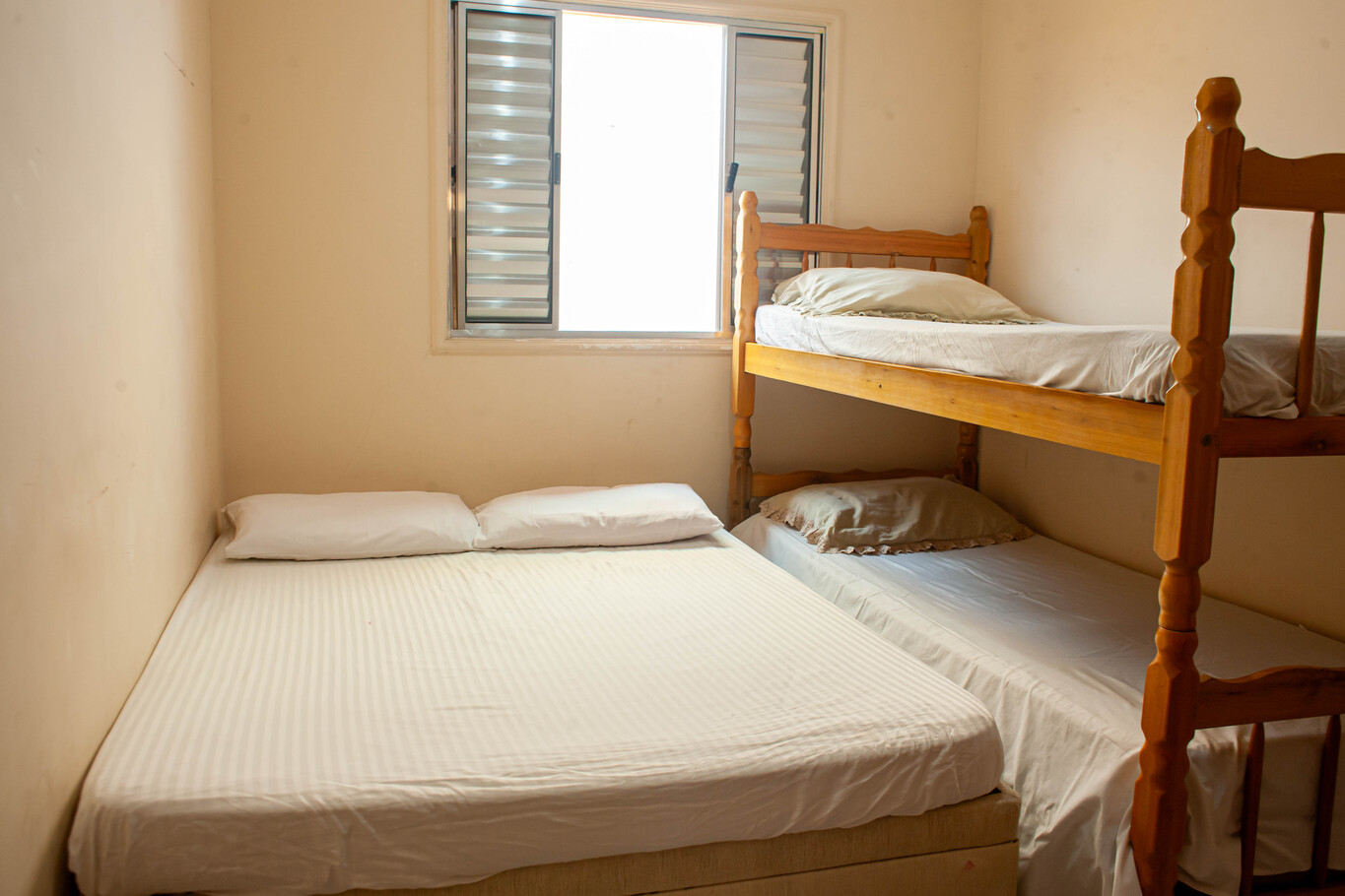 - In the bedroom there is 1 double bed, 1 bunk bed and mattress protector