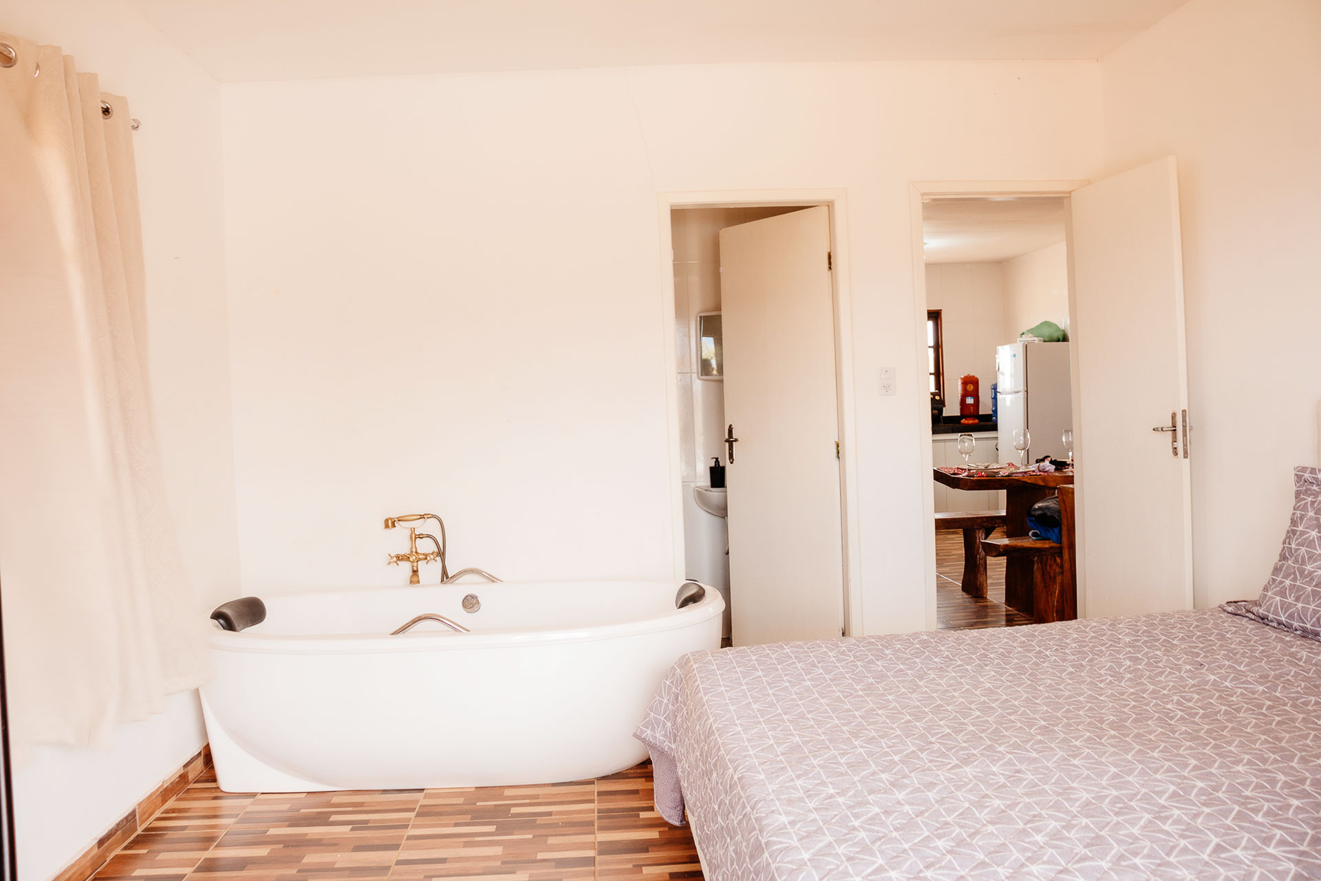 - Os banheiros possuem chuveiro a gás, box de vidro/acrílico e banheira