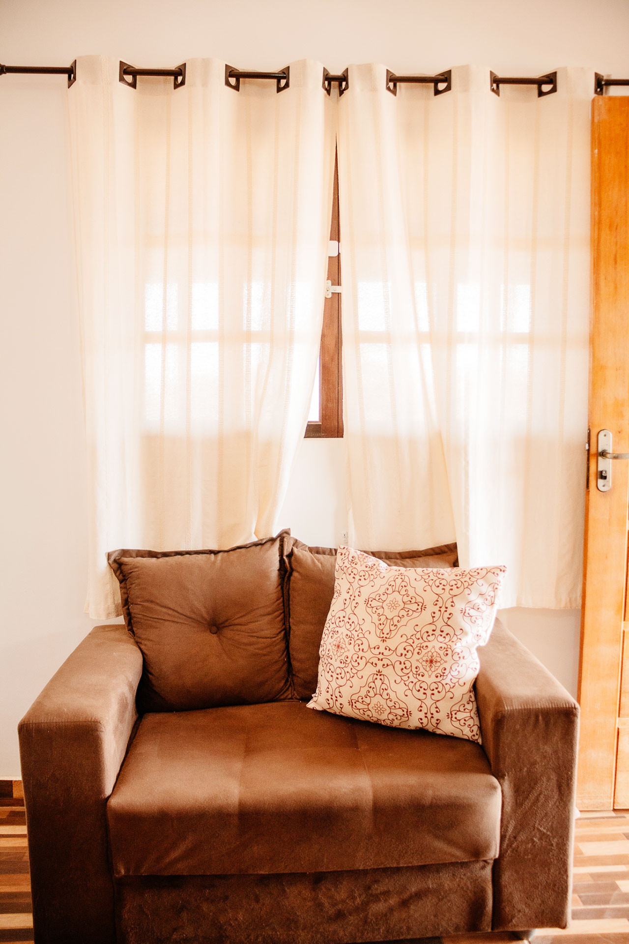 - Na sala você encontra cadeira, mesa de centro, poltrona, sofá e TV a cabo