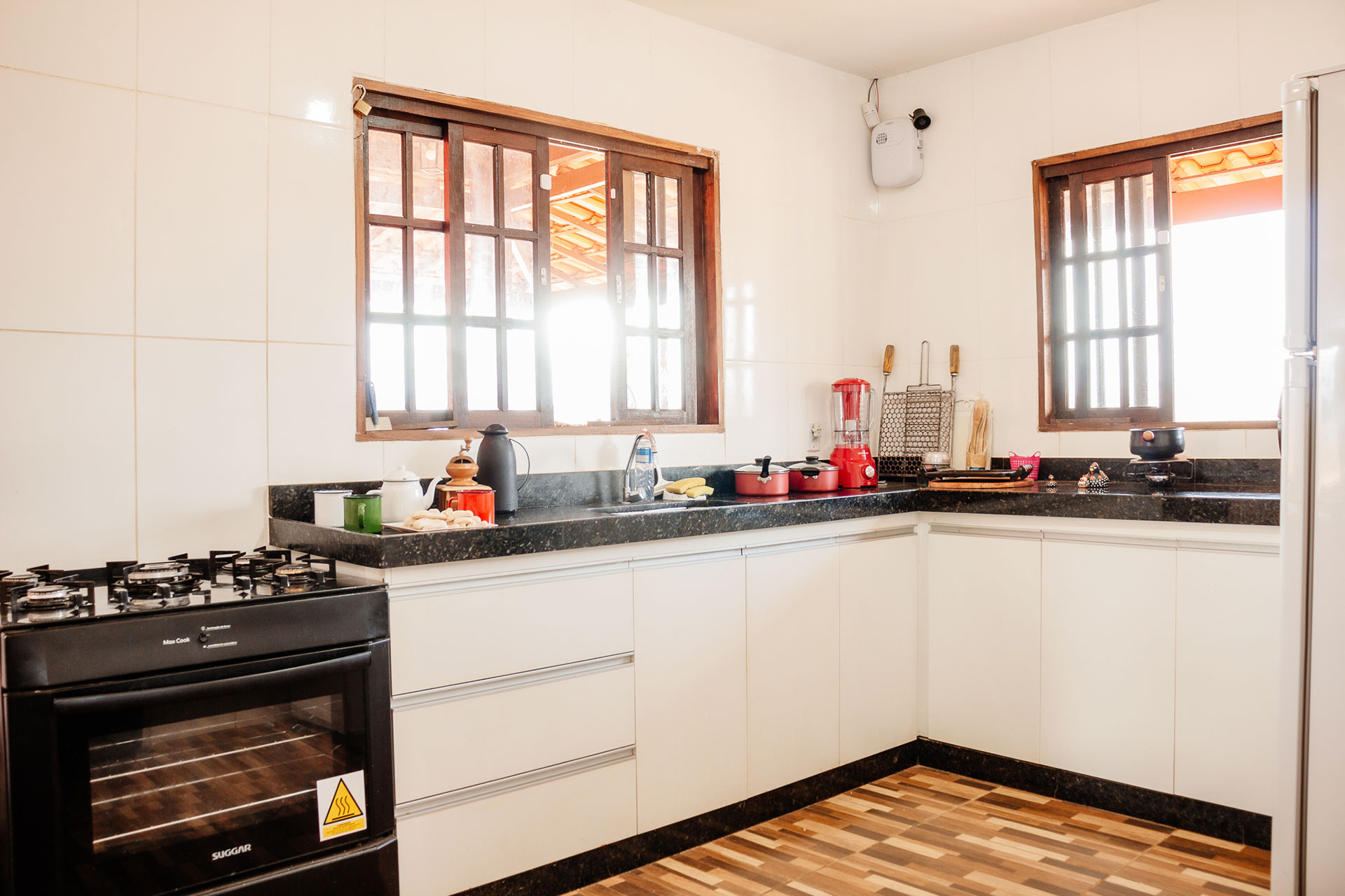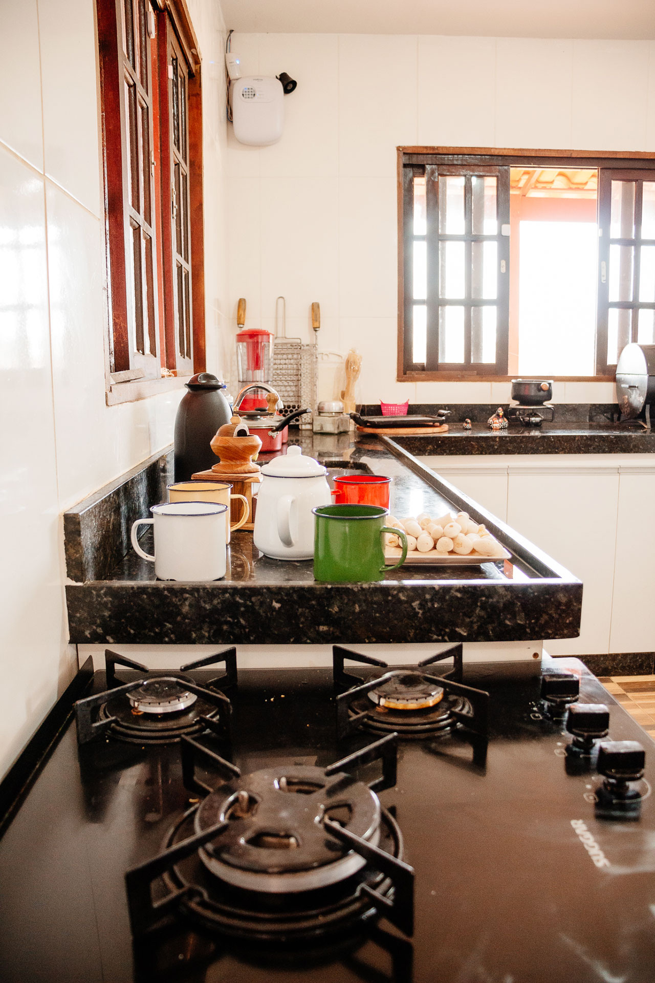 - A cozinha é equipada com todos os utensílios necessários para preparar suas refeições, incluindo geladeira, fogão, liquidificador, purificador/filtro e balcão