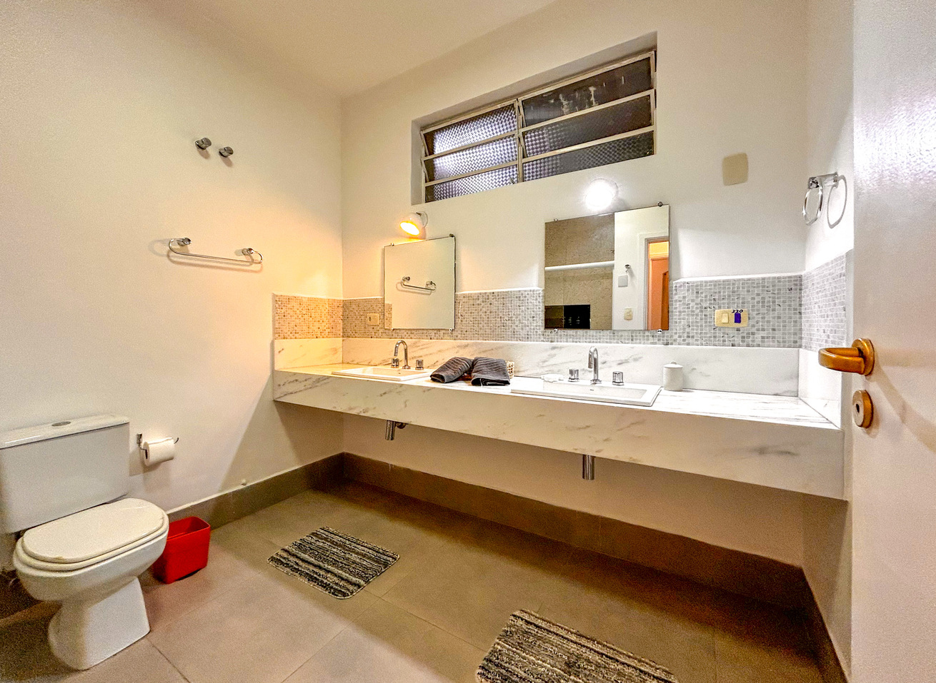 - Spacious social bathroom between bedrooms with double sink and gas shower