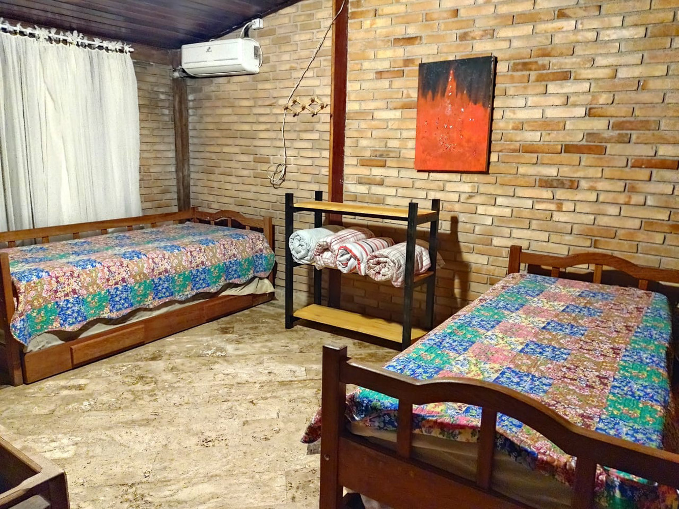 - Todos os quartos são suítes com chuveiro elétrico, box de vidro e em um deles há secador de cabelo. Neles, você encontrará armário, edredom, protetor de colchão e ventilador de teto