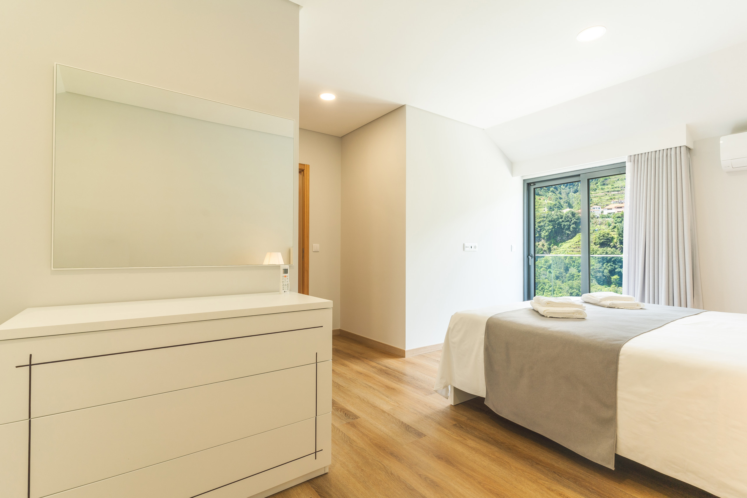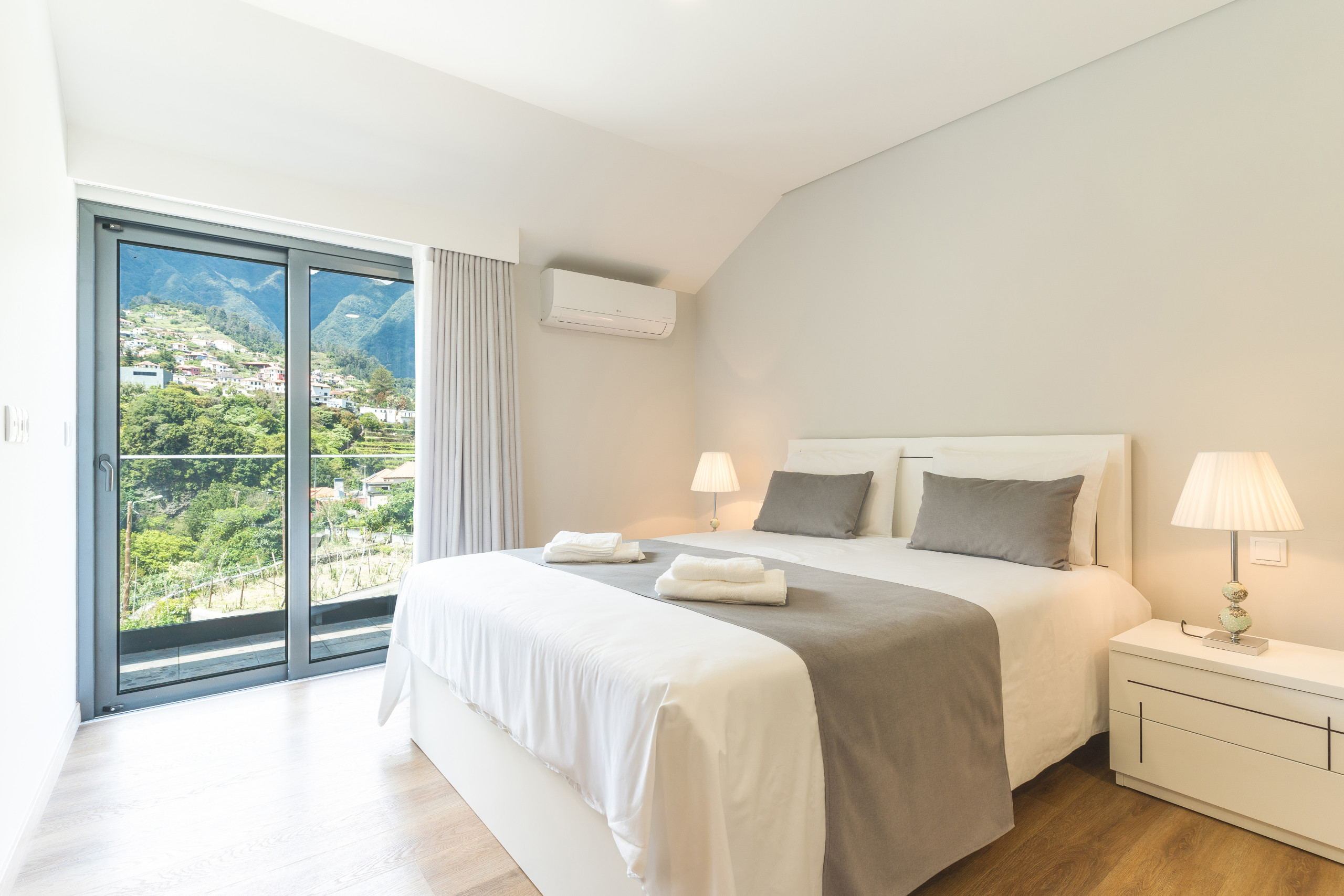 There are two bedrooms, each with a queen-size bed and private en-suite bathroom with a walk-in shower. A third guest bathroom is also available. In the living room, there’s a sofa bed that can sleep one more guest. Both bedrooms share a balcony that offers wide views of the surrounding mountains, a peaceful spot to start or end the day.