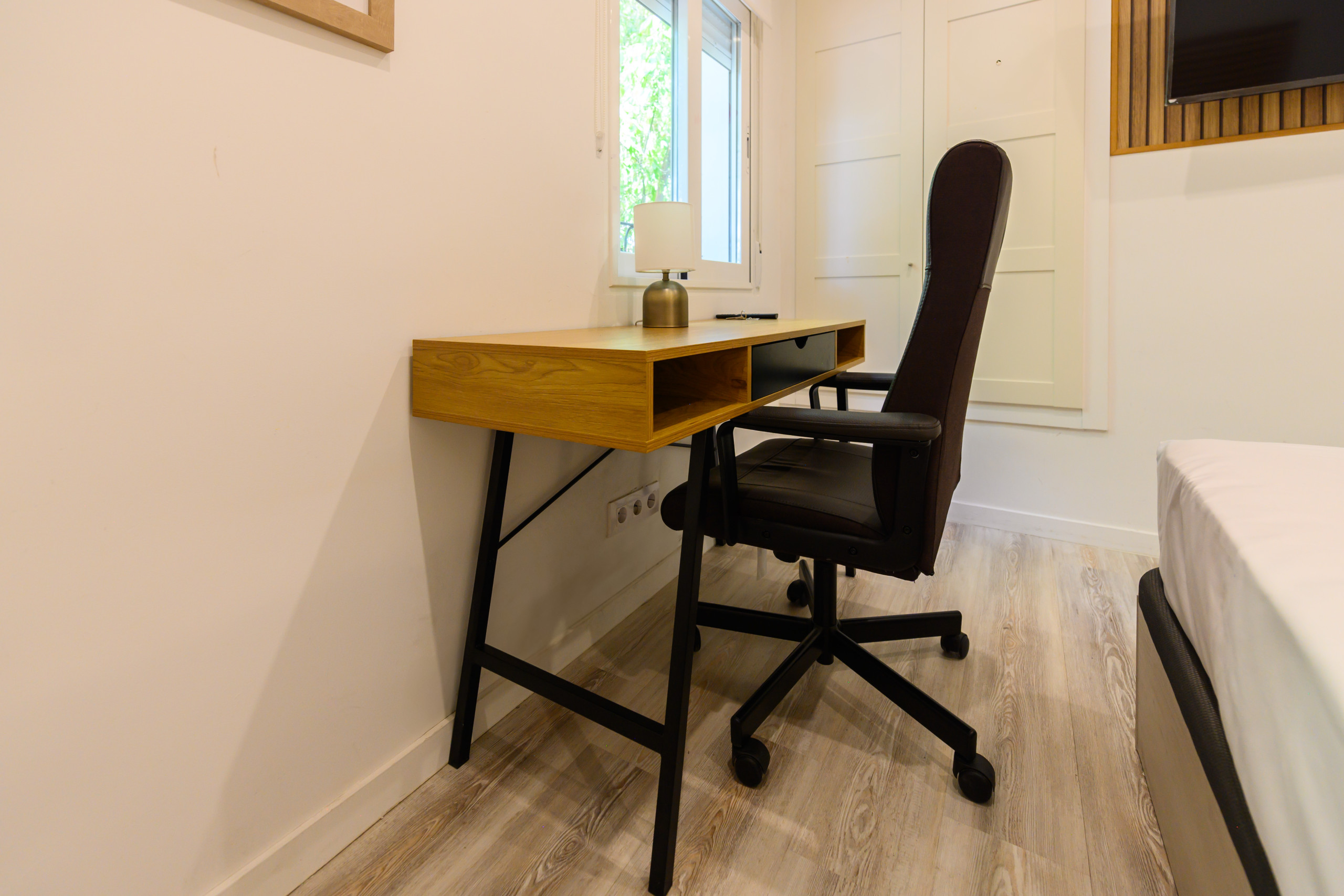 Room 4–La Paz: Room with views, inside the Hogar de Belén housing, Temporary Rental Located on the first floor, it has all the amenities that any student may demand. From the bed with a premium mattress, bed base with great storage, desk + chair, to smart TV, air conditioning, safe, iron+ironing board, wireless charger, smart lock, 2 sets of towels and sheets.