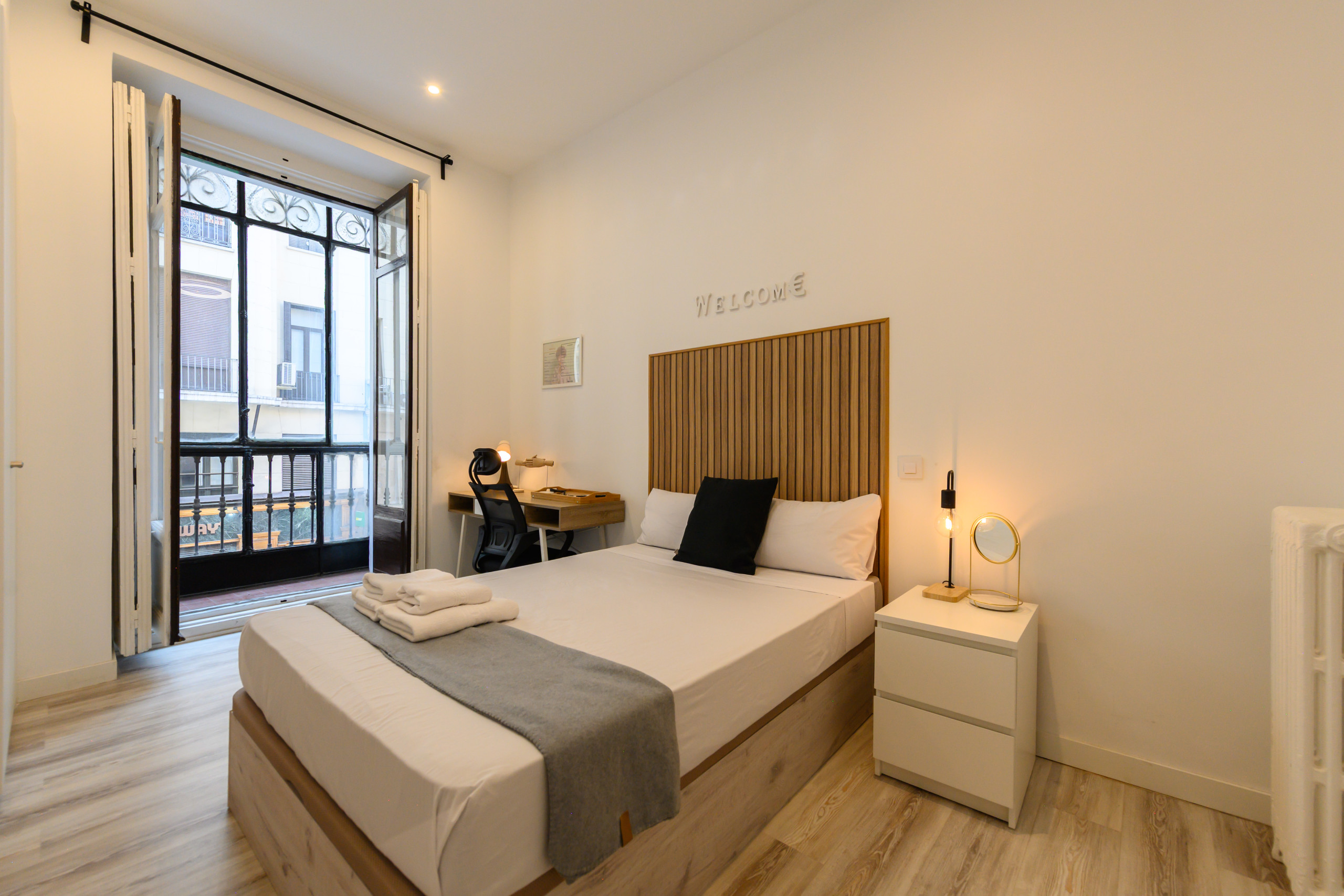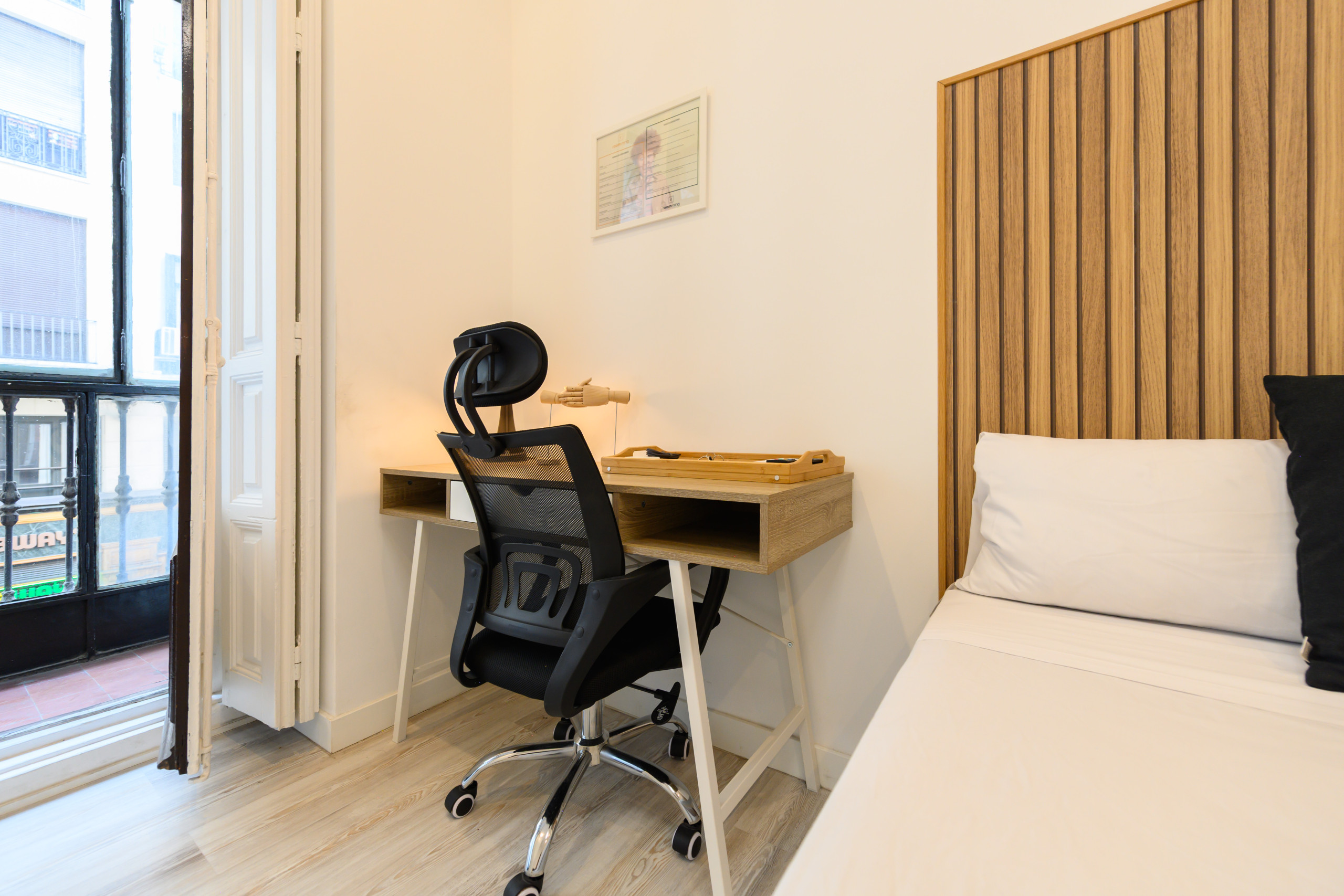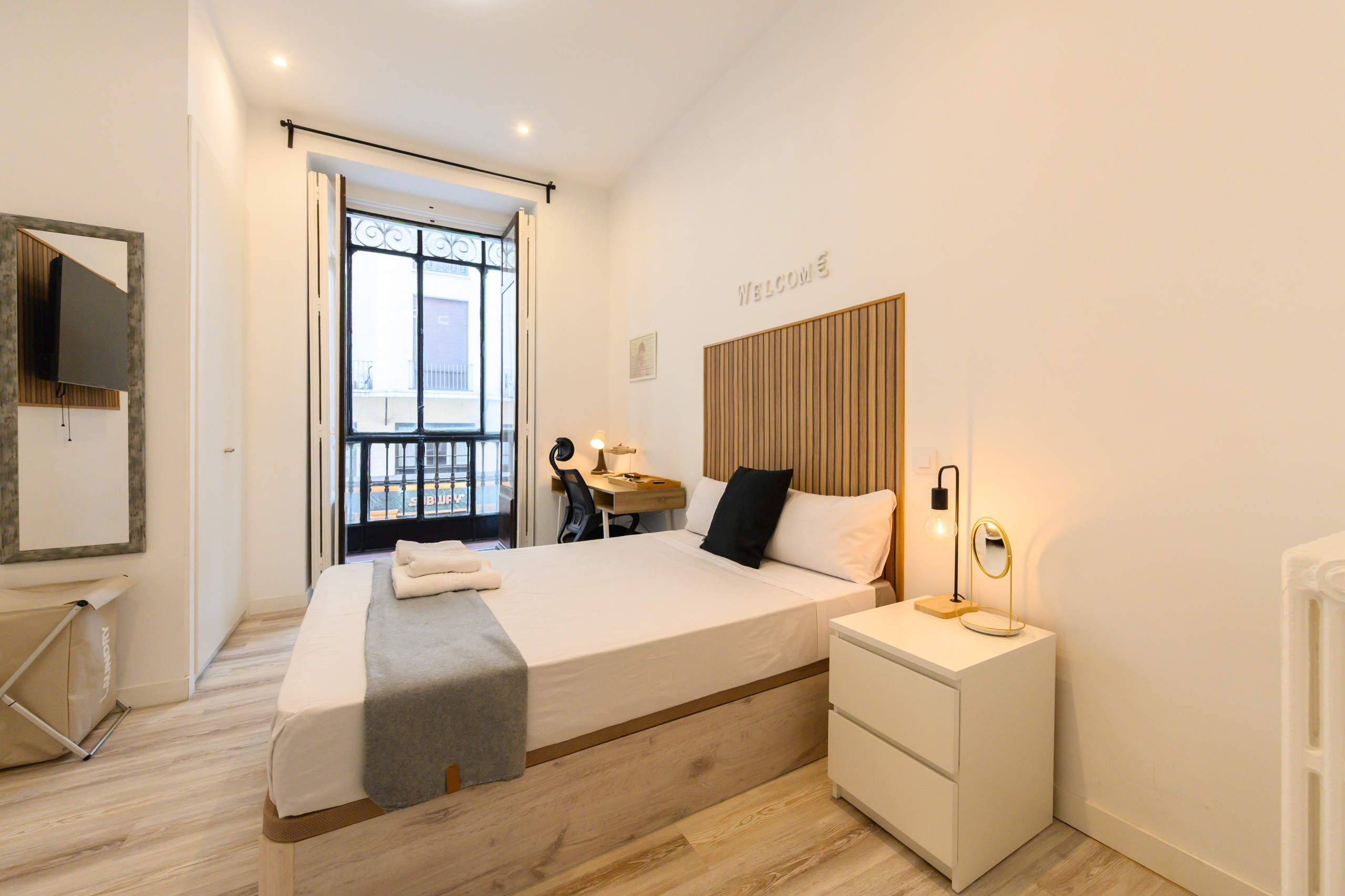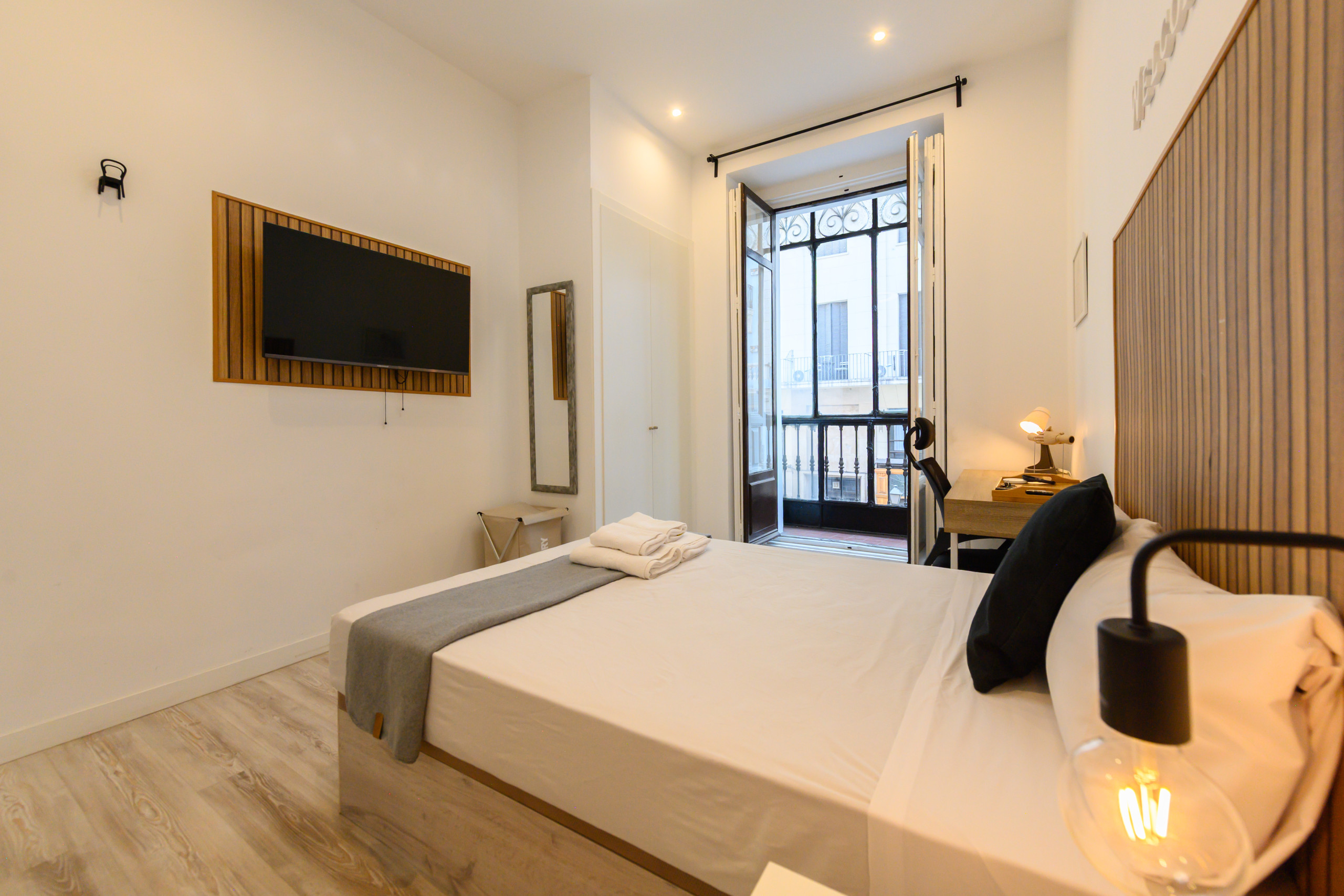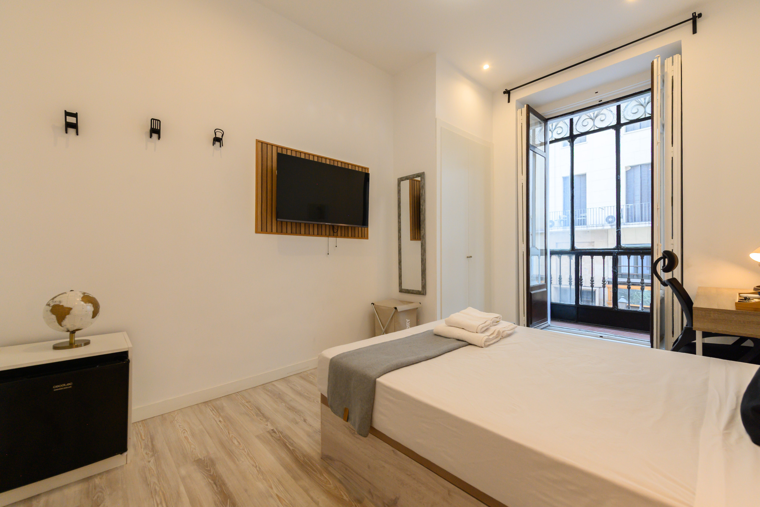 Temporary Rental Floor. Room 5 - Zurich: VIP PREMIUM Room with glazed balcony, with views. Located on the fifth exterior within the dwelling, it has all amenities, from the bed with a premium mattress, storage bed base, desk + chair, to smart TV, air conditioning, safe, iron+ironing board, wireless charger, smart lock, 2 sets of towels and sheets.