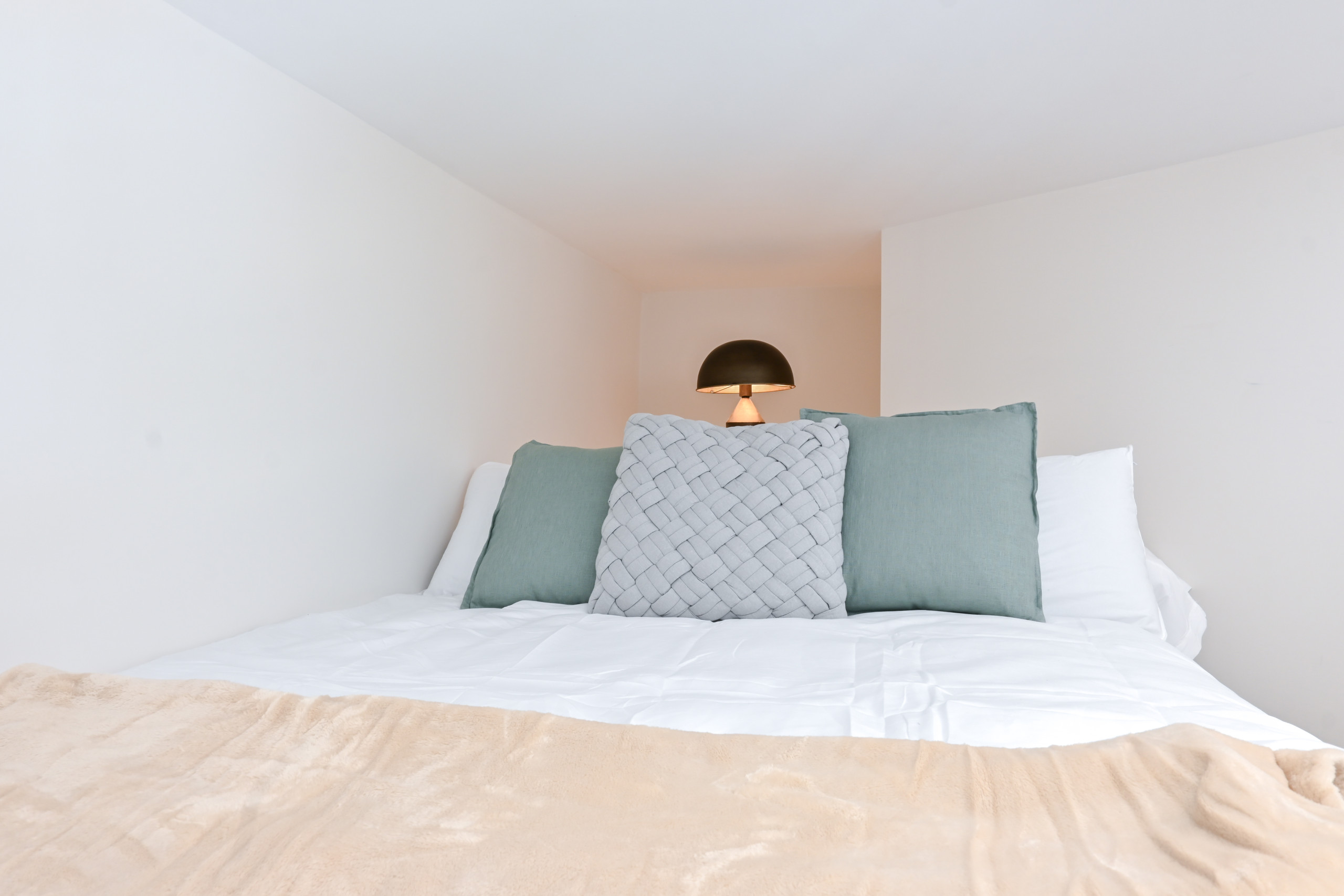The bed is located in a mezzanine, an elevated level overlooking the living-dining room, offering an intimate and cosy environment for sleeping.