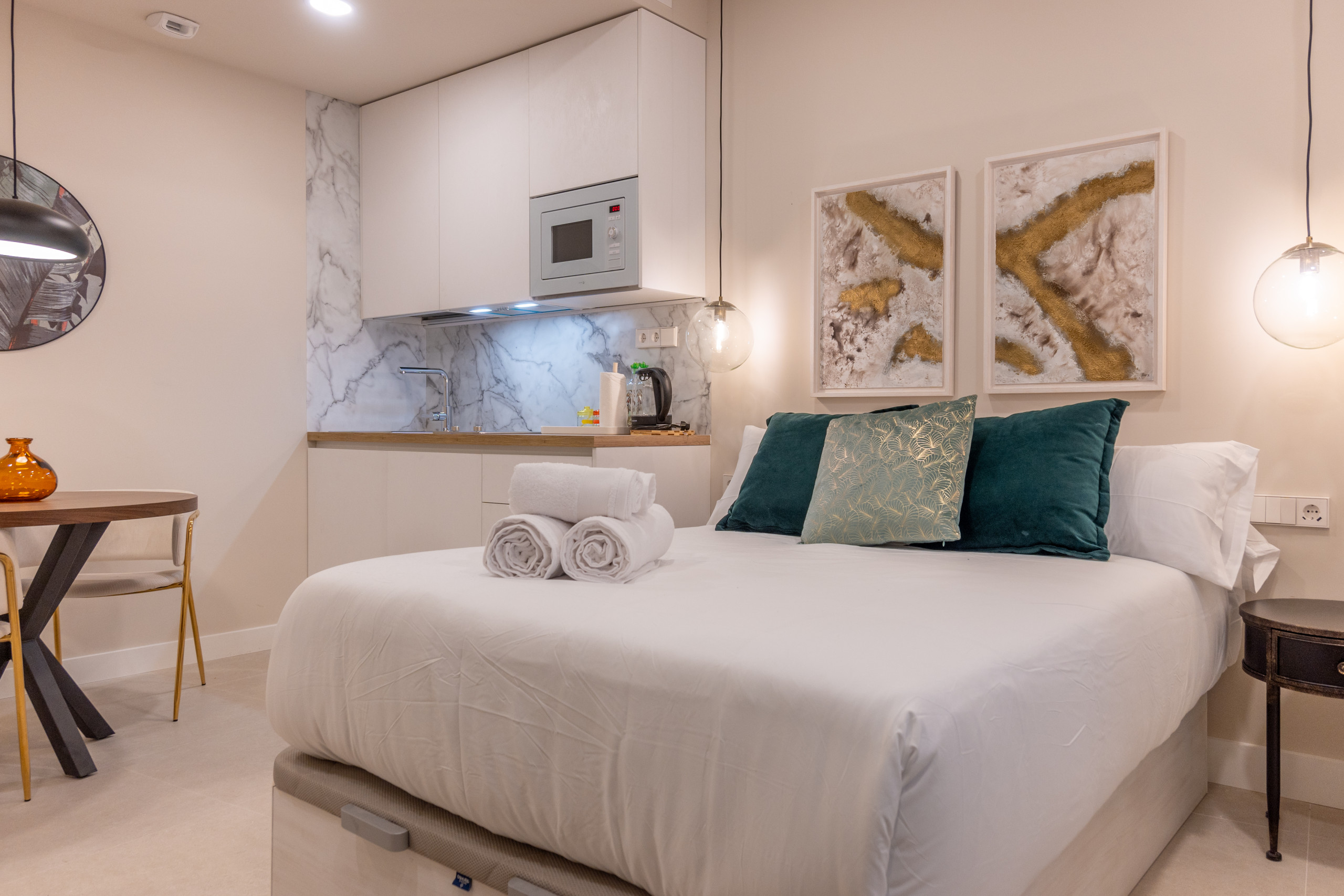 The studio has a fully equipped kitchen and an integrated dining room, perfect for enjoying your meals in comfort. The rest area has a comfortable double bed, next to a desk ideal for both working and being inspired by the tranquility of the surroundings. The spacious and modern bathroom includes a generous shower, designed to offer you moments of relaxation after a day discovering Madrid.
