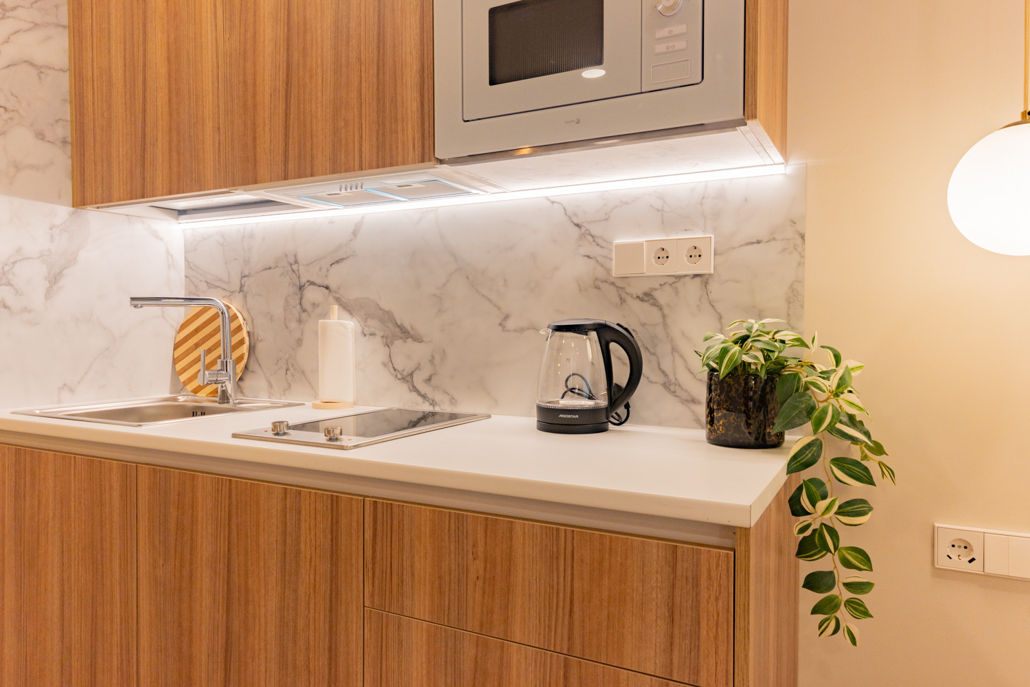The apartment has been designed to offer everything necessary to fully enjoy your stay. It features a spacious and comfortable double bed that guarantees restful sleep, a practical desk ideal for working or planning your activities, and a fully equipped American kitchen, perfect for preparing your favourite meals. Next to it, a dining table invites you to enjoy pleasant and relaxed moments.