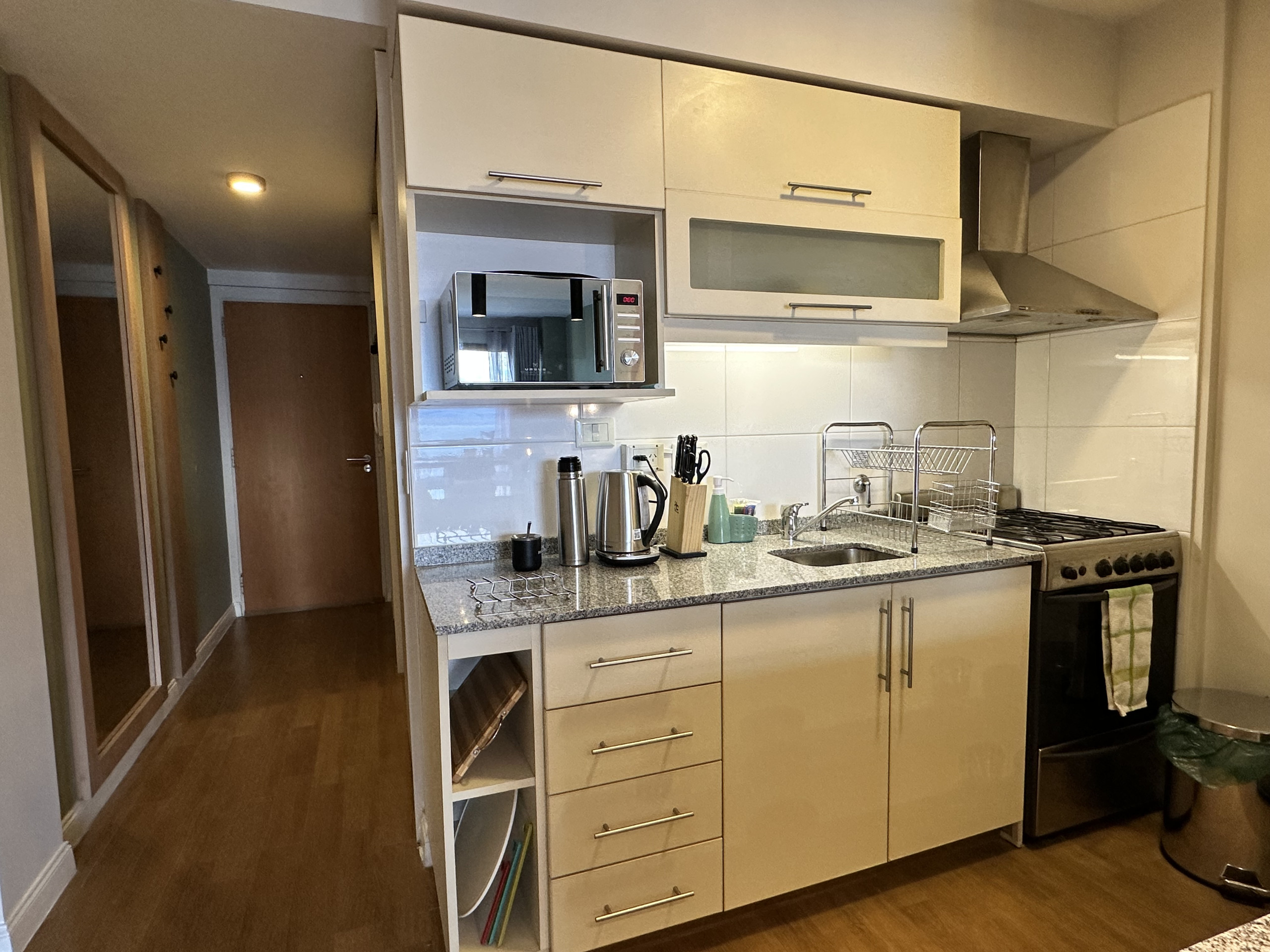 The department is located right in the centre of Bariloche, it is a studio apartment for two people, modern and with incredible views of our beloved Lake Nahuel Huapi. It has a double bed, a fully equipped kitchen with microwave, toaster, electric kettle, gas stove and all the necessary utensils so that you can cook. The apartment's heating is by radiators. Full bathroom with bathtub.
