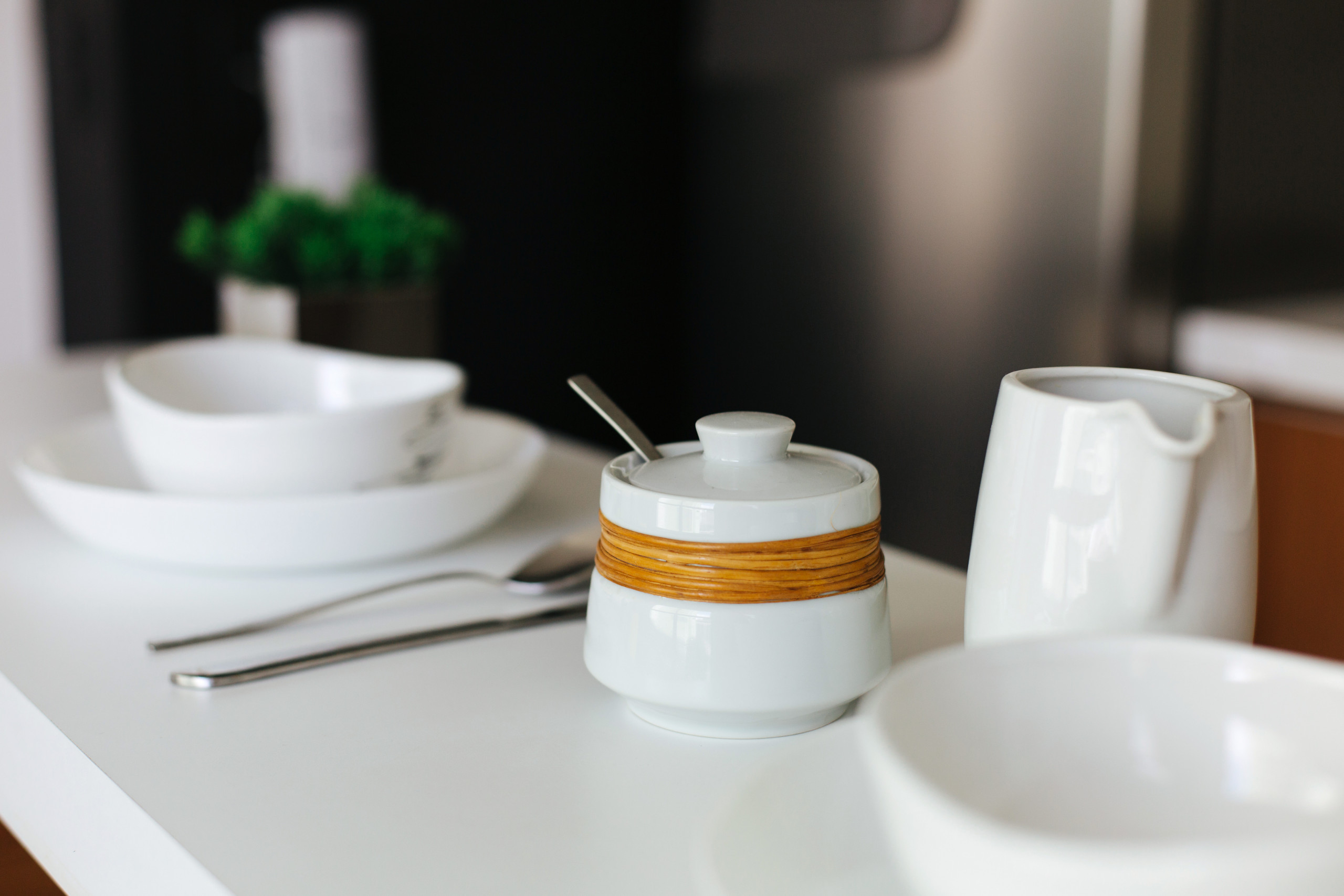 Cutlery, plates, bowls, salad bowl, glasses, cups, wine glasses, pots, multi-purpose jars and wine opener.