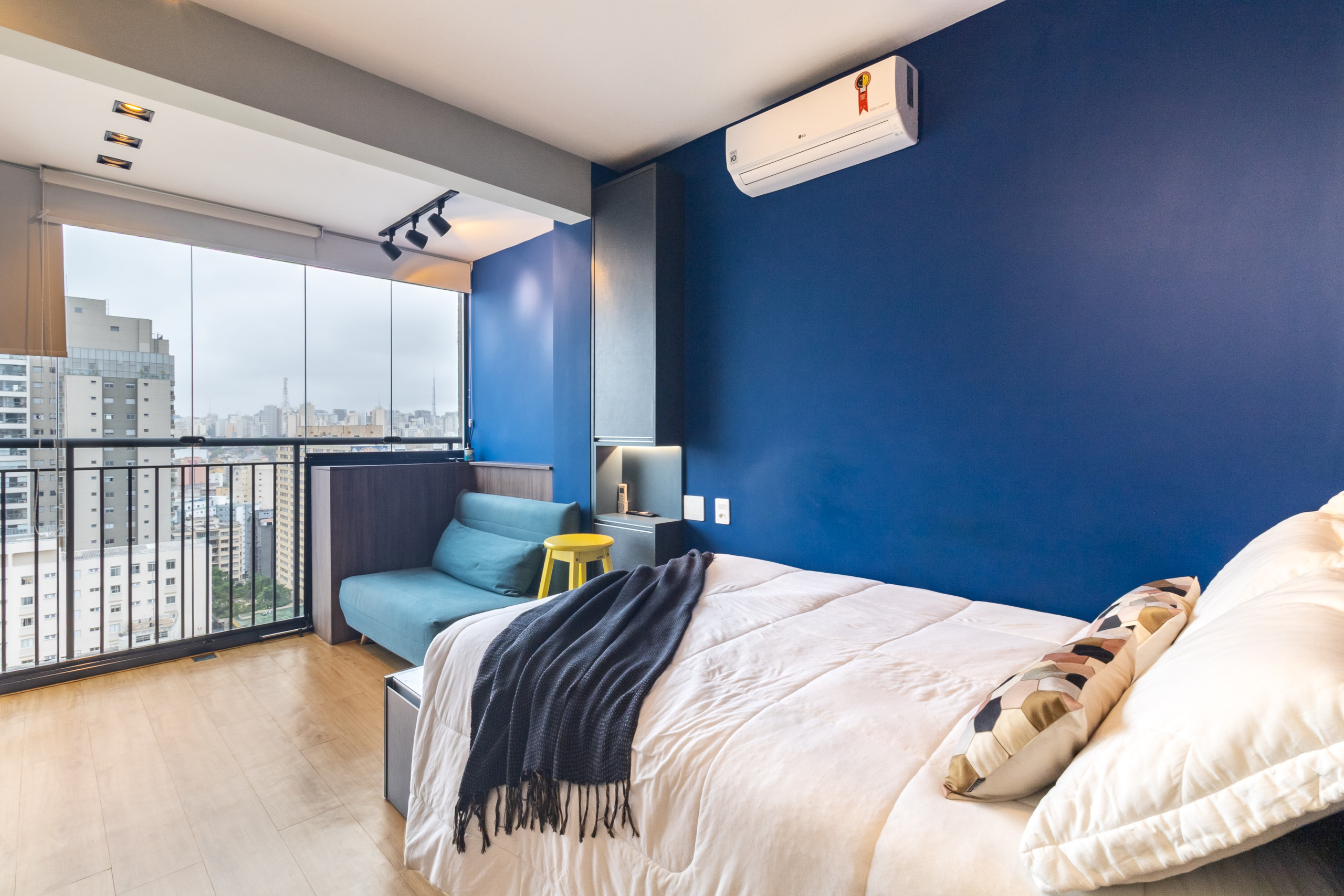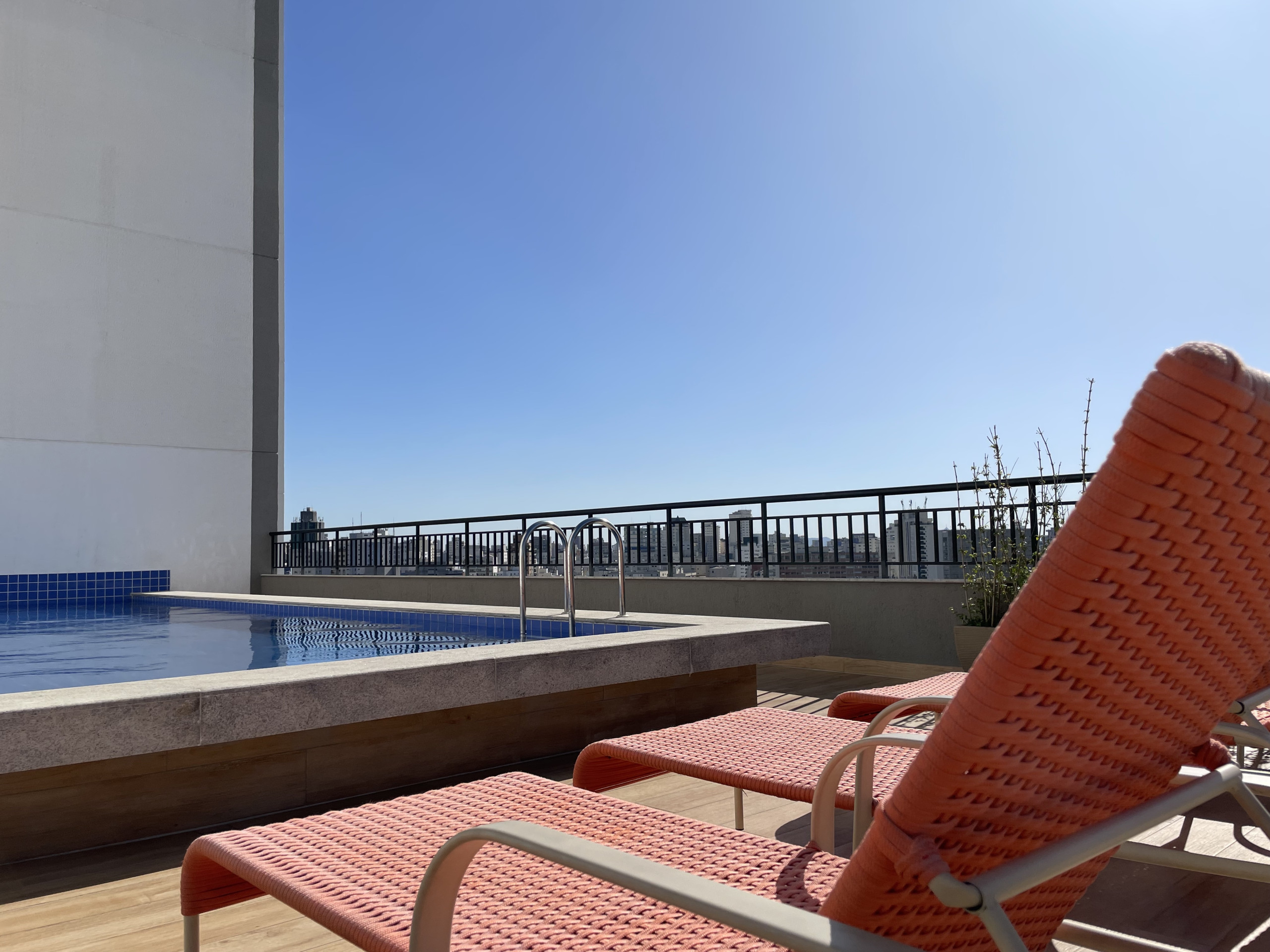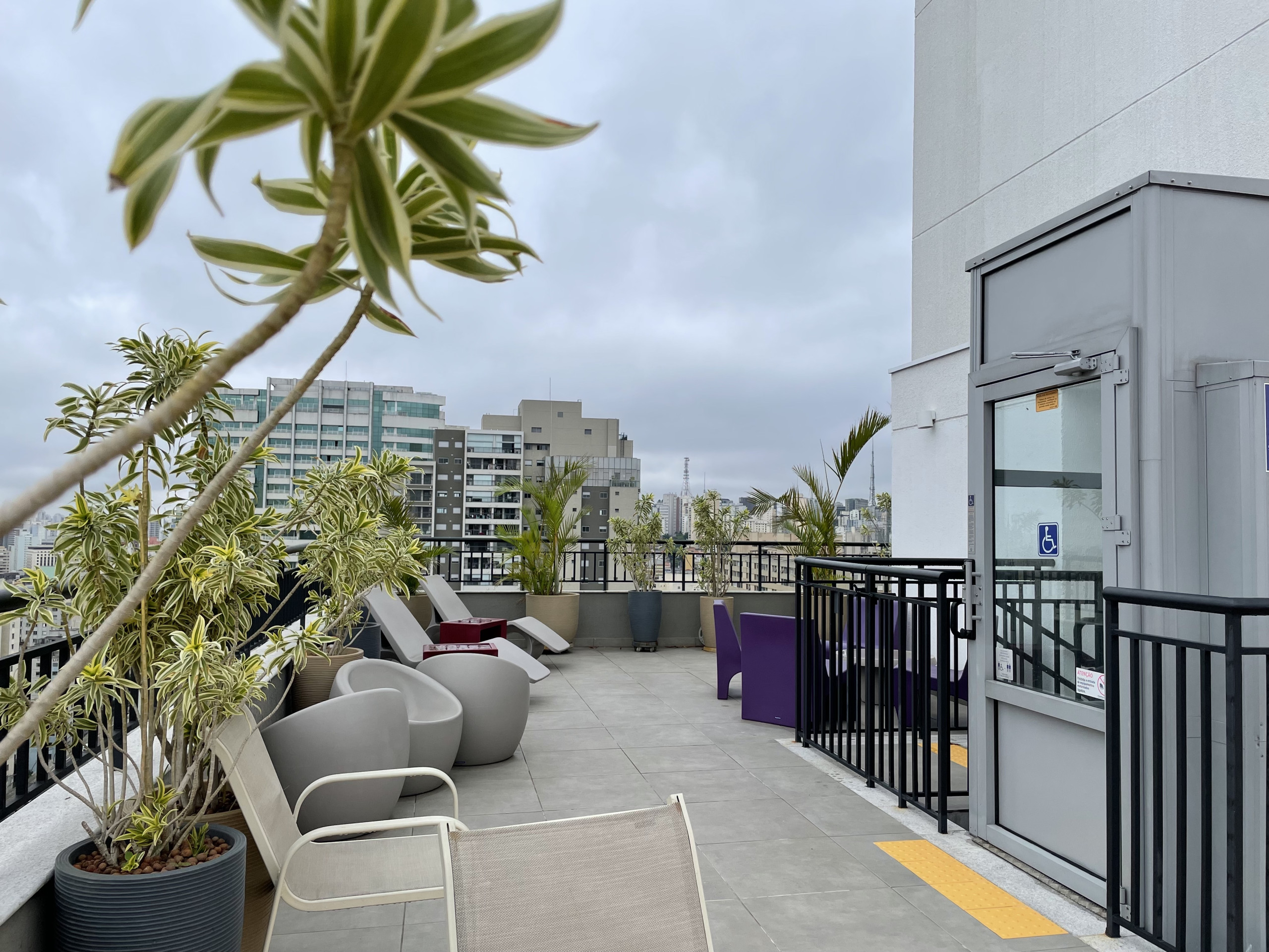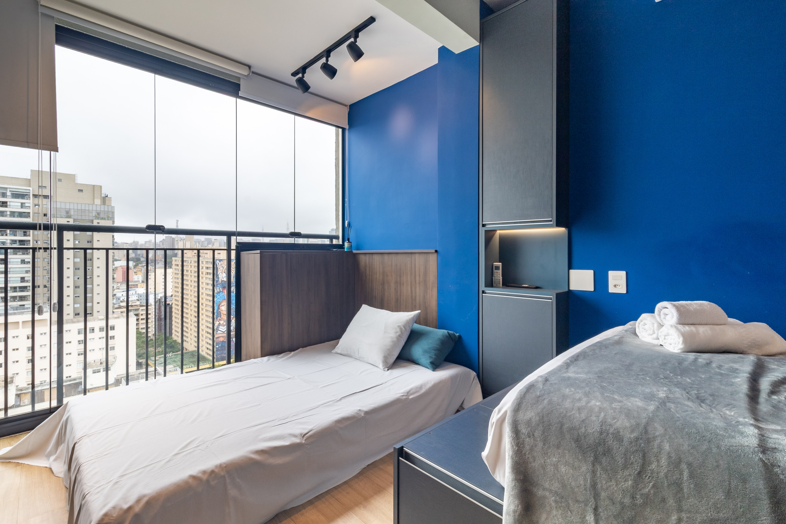 Modern studio for 3 people with balcony and panoramic view. Privileged location near Higienópolis-Mackenzie metro, Augusta Street and Mackenzie University. Air-conditioned, with 300mb Wi-Fi and equipped kitchen. The building offers rooftop pool, gym and coworking. Perfect for work or leisure in the heart of the city.
