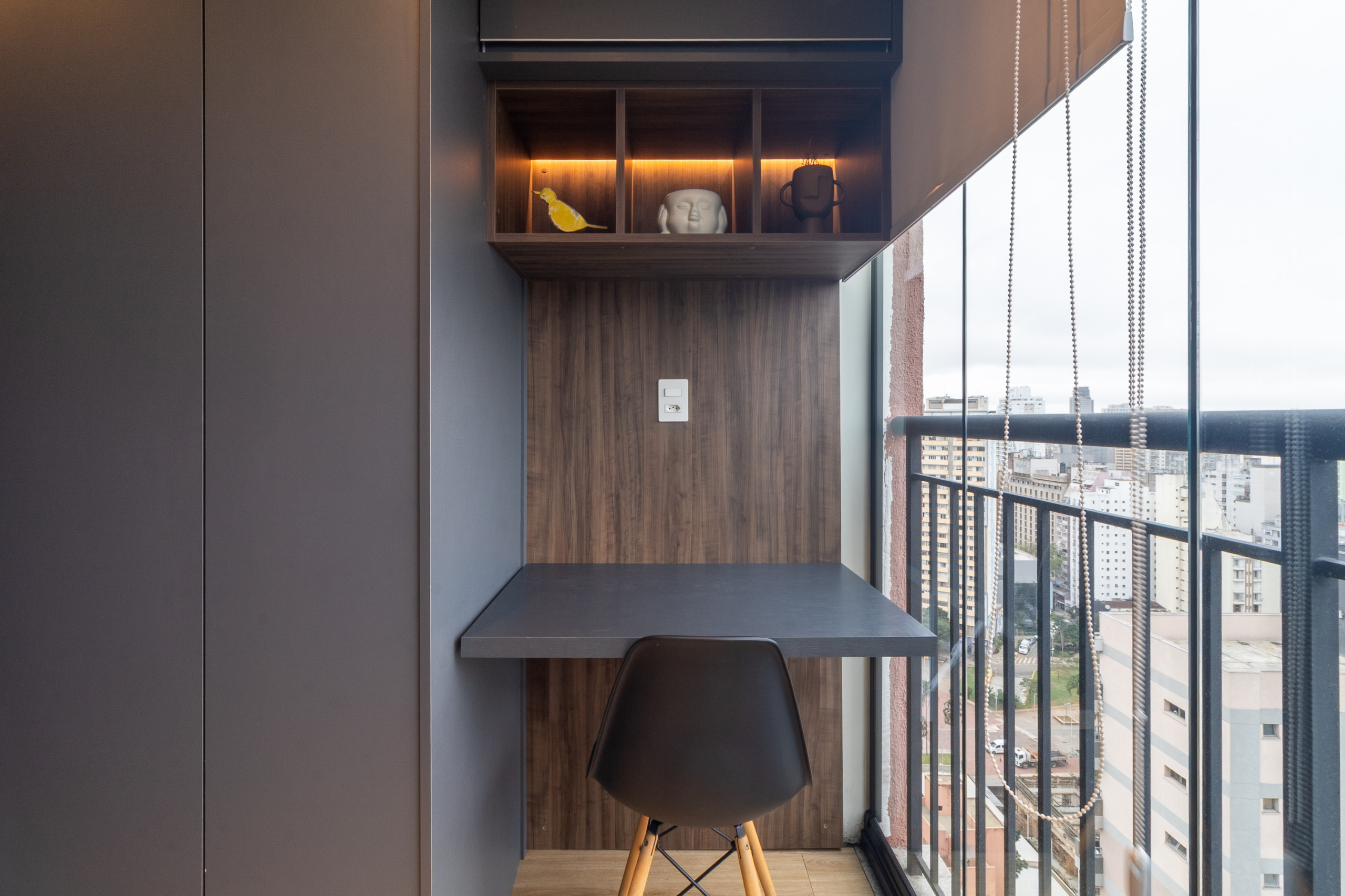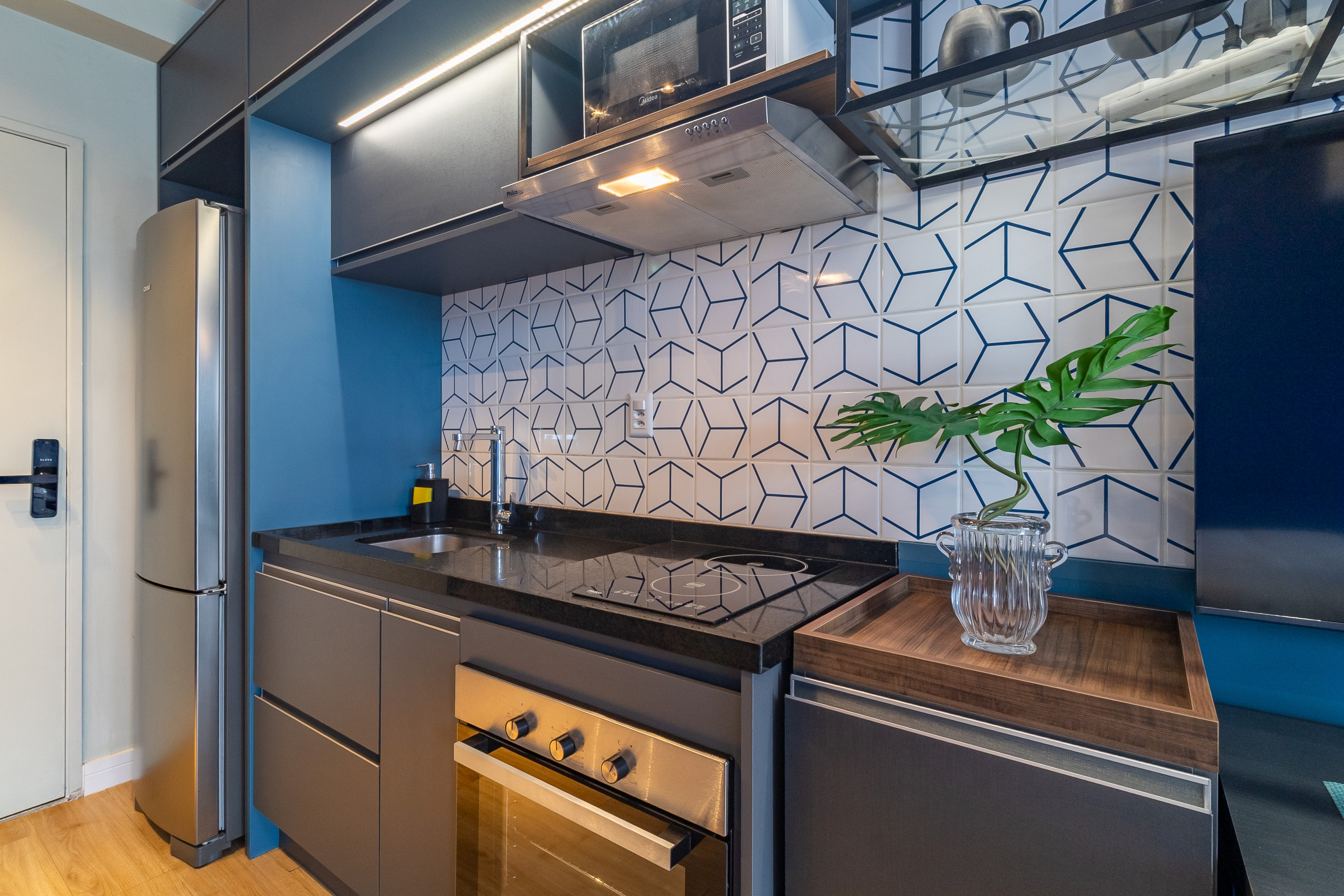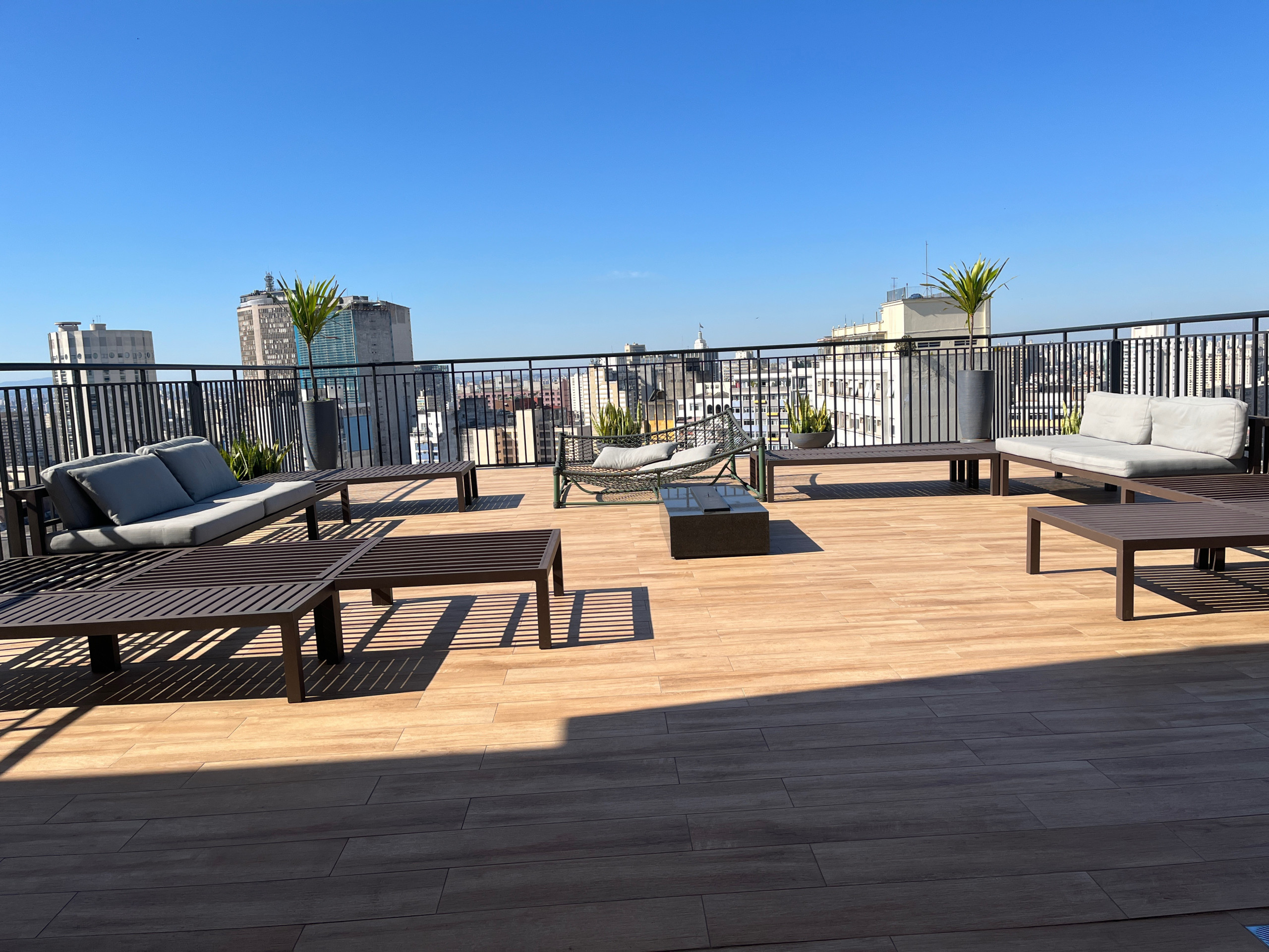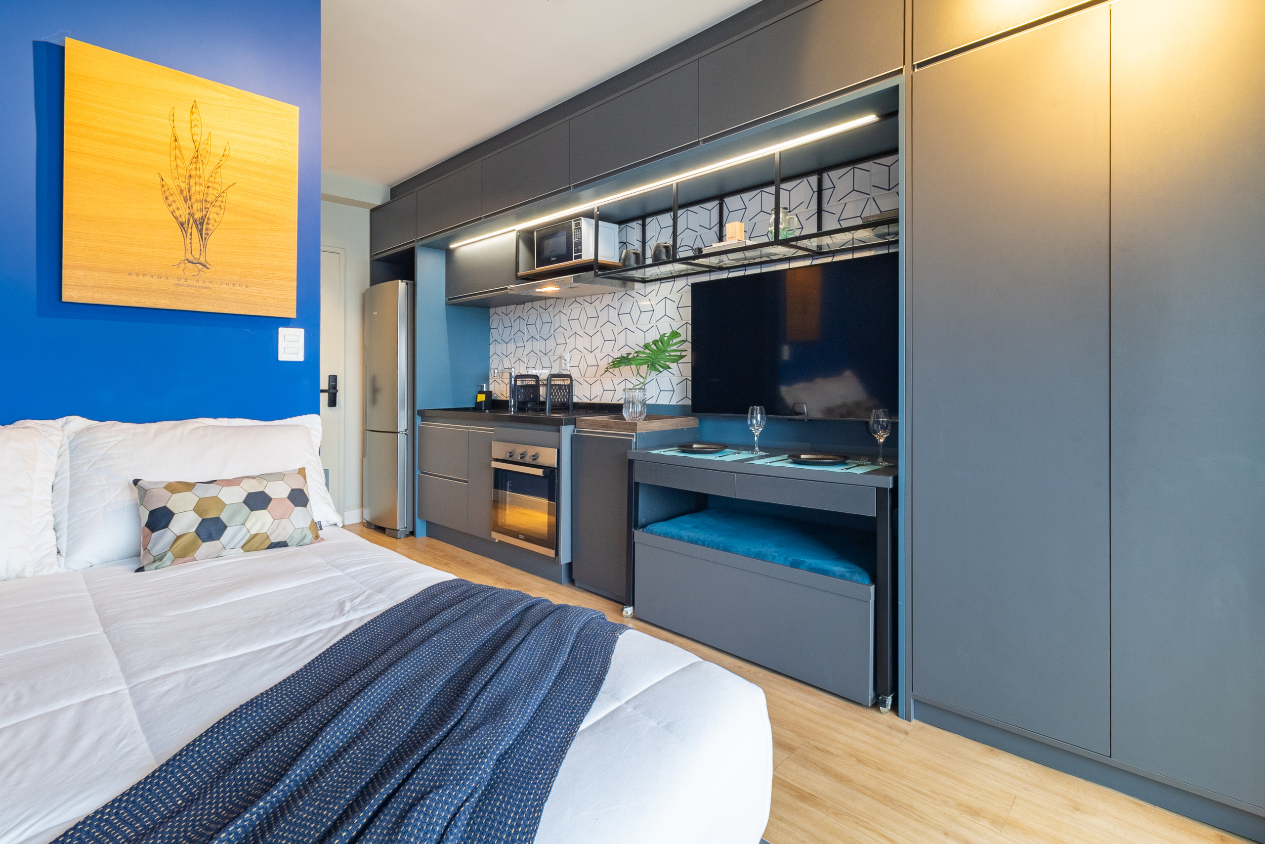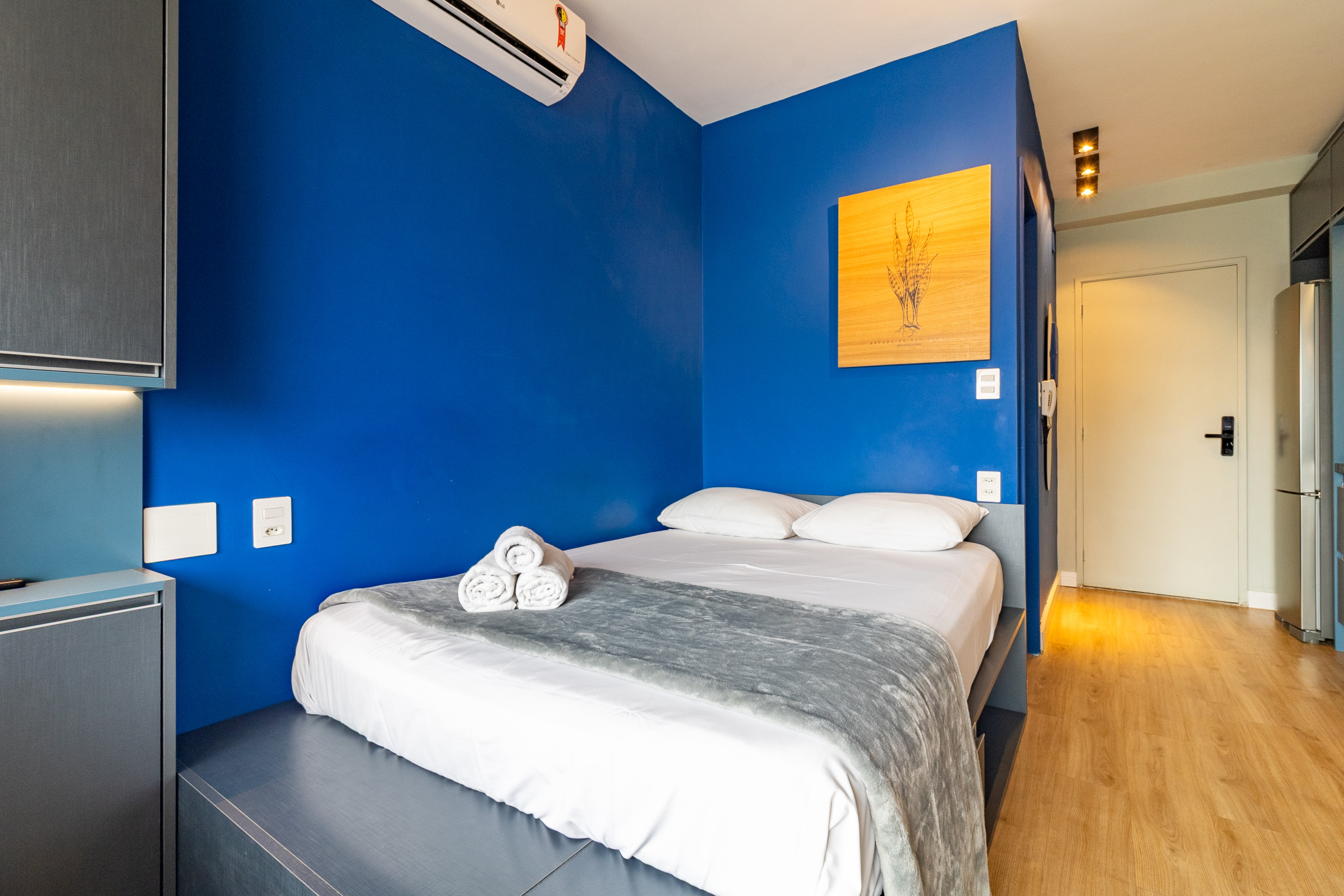 Modern studio for 3 people with balcony and panoramic view. Privileged location near Higienópolis-Mackenzie metro, Augusta Street and Mackenzie University. Air-conditioned, with 300mb Wi-Fi and equipped kitchen. The building offers rooftop pool, gym and coworking. Perfect for work or leisure in the heart of the city.