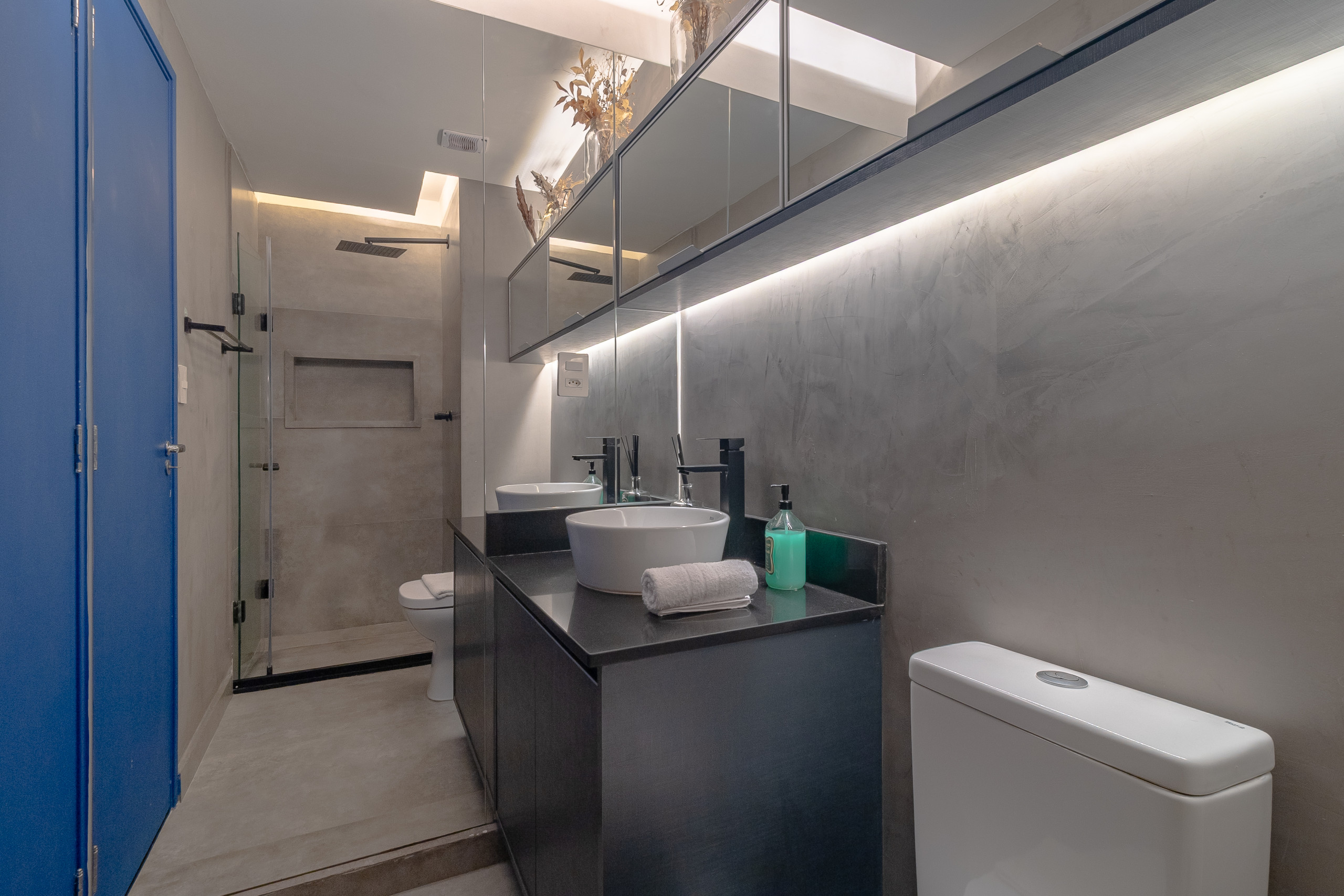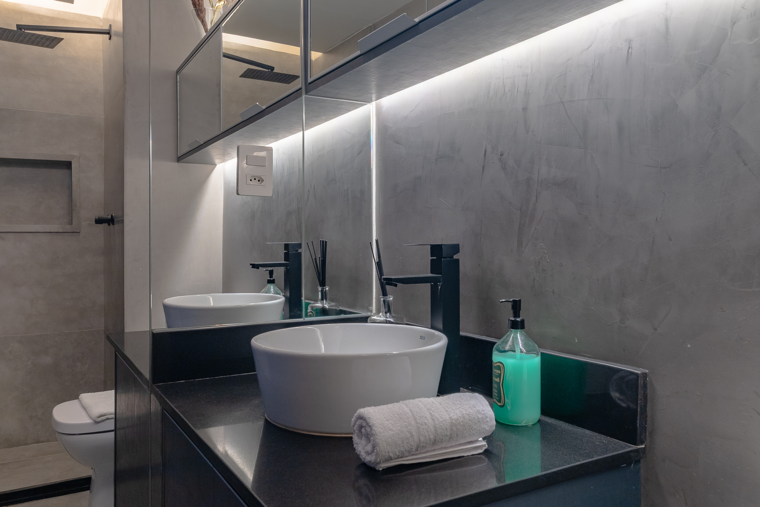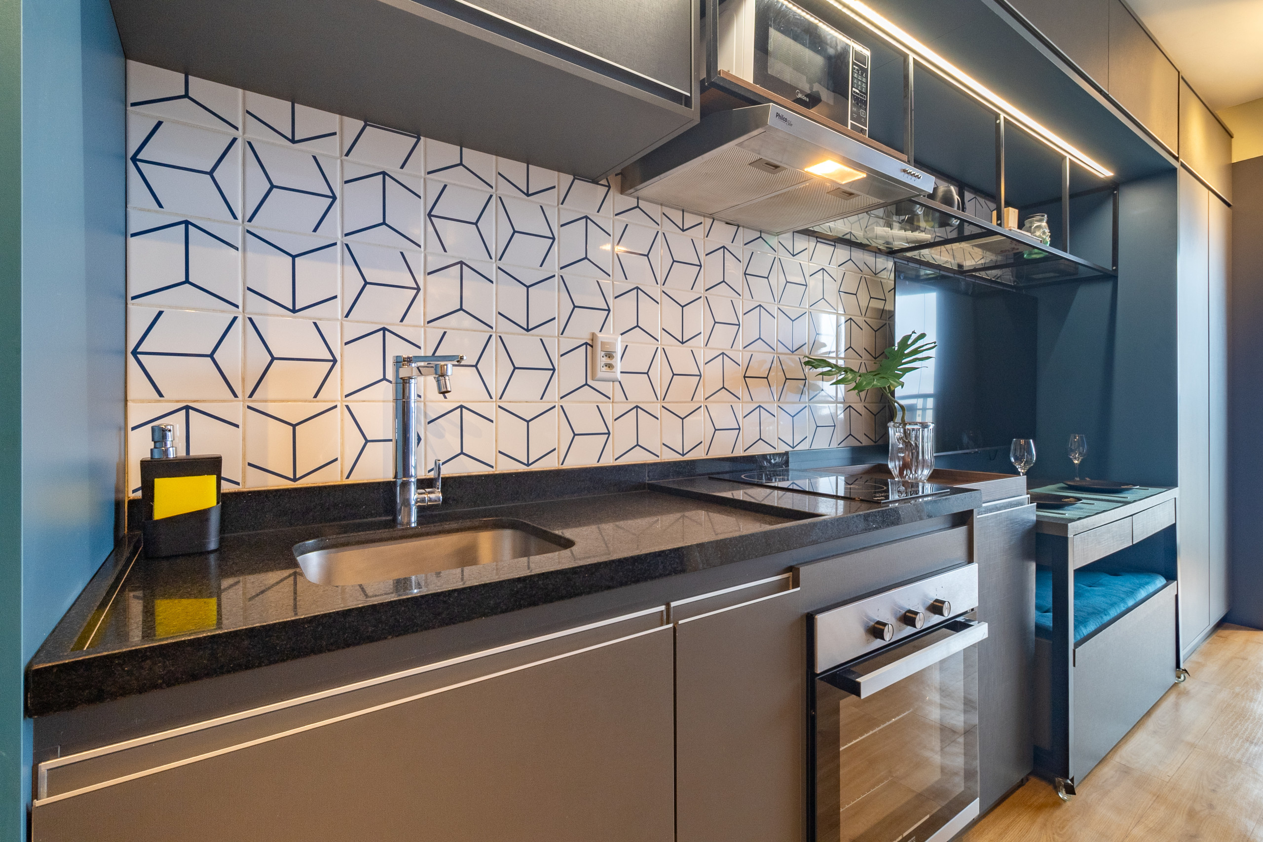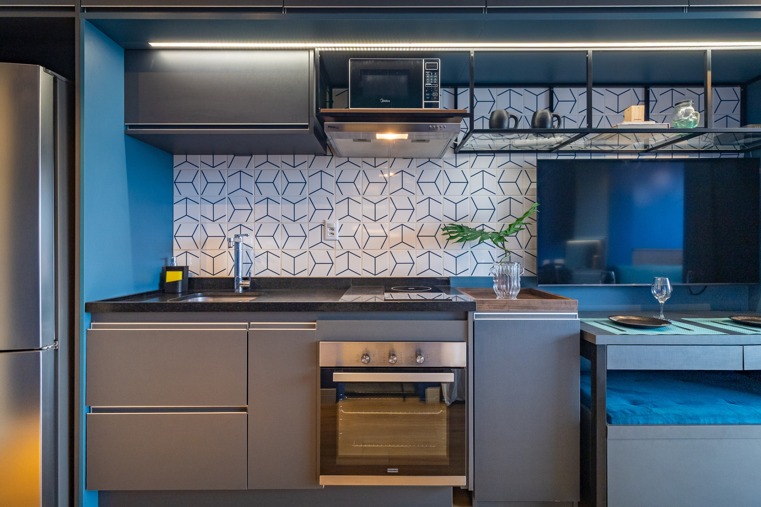 Modern studio for 3 people with balcony and panoramic view. Privileged location near Higienópolis-Mackenzie metro, Augusta Street and Mackenzie University. Air-conditioned, with 300mb Wi-Fi and equipped kitchen. The building offers rooftop pool, gym and coworking. Perfect for work or leisure in the heart of the city.