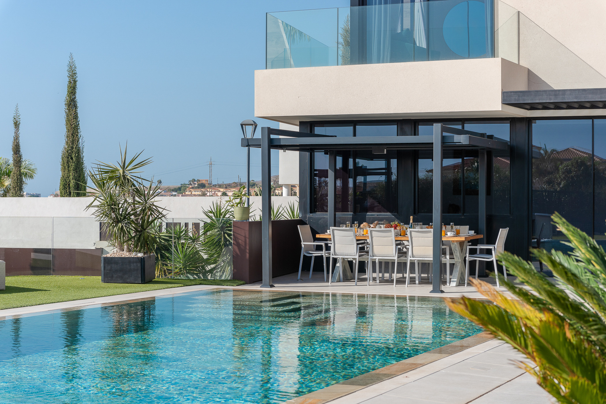 With 4 spacious suite-style bedrooms, this villa comfortably accommodates up to 8 people. Each room has been designed as a private comfort refuge, including the main suite, which features an en-suite bathroom with a bathtub, ideal for disconnecting and relaxing with total privacy.